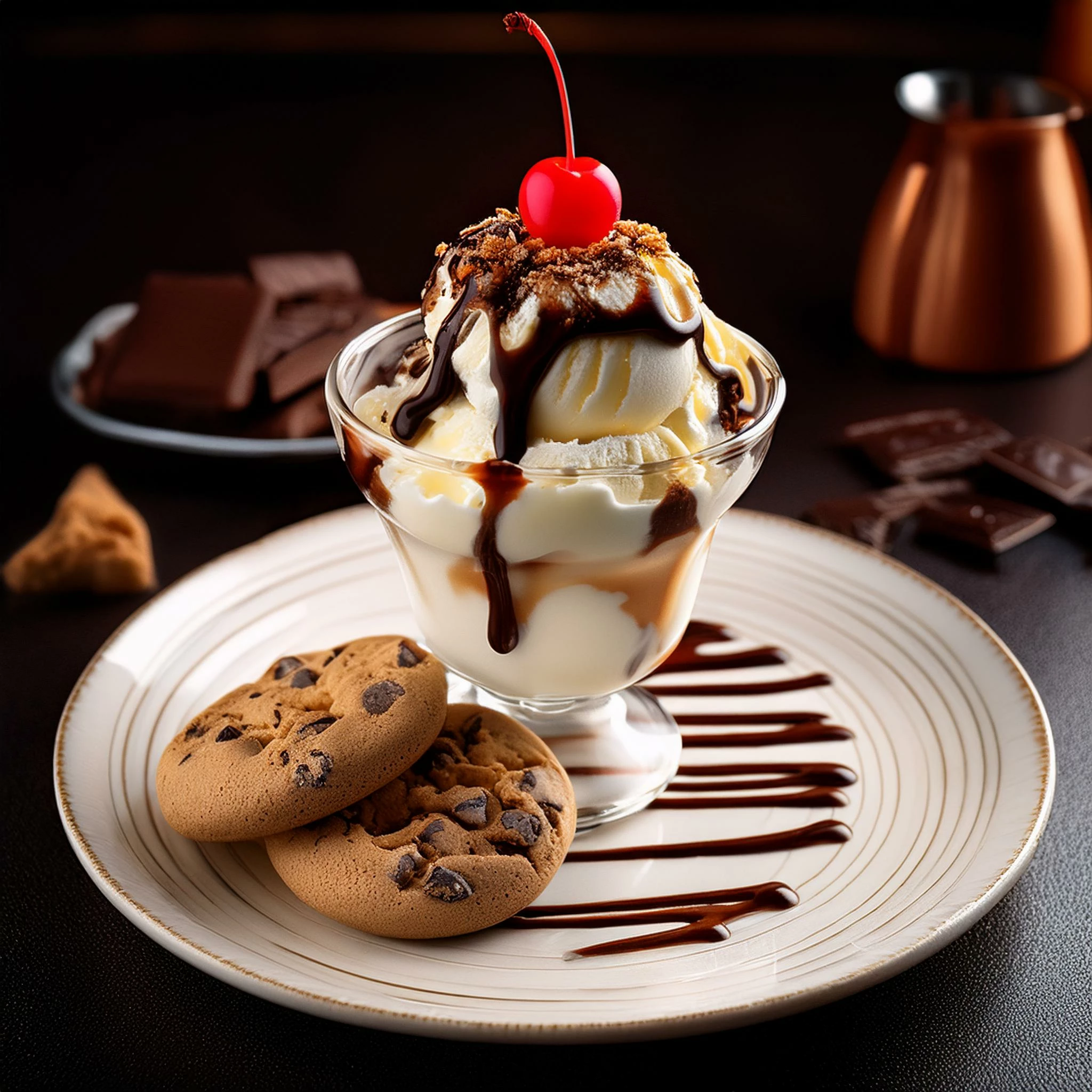 a vanilla ice cream sundae with hot chocolate syrup and a cherry on top with a chocolate chip cookies on a plate