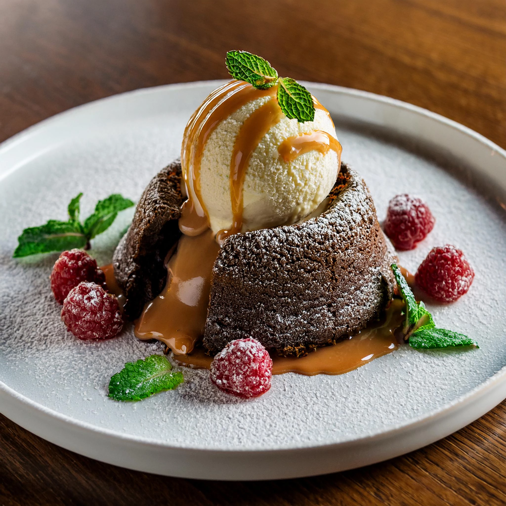 Create a close-up image of a mouth-watering dessert. The dessert is a rich, has two layers, decadent chocolate lava cake, topped with a scoop of chocolate ice cream. The cake is oozing warm, molten chocolate from the center, with the ice cream slowly melting and creating a creamy contrast. Surround the cake with a drizzle of caramel sauce and garnish with fresh raspberries and a sprig of mint. The background should be a rustic wooden table to enhance the warmth and indulgence of the dessert.