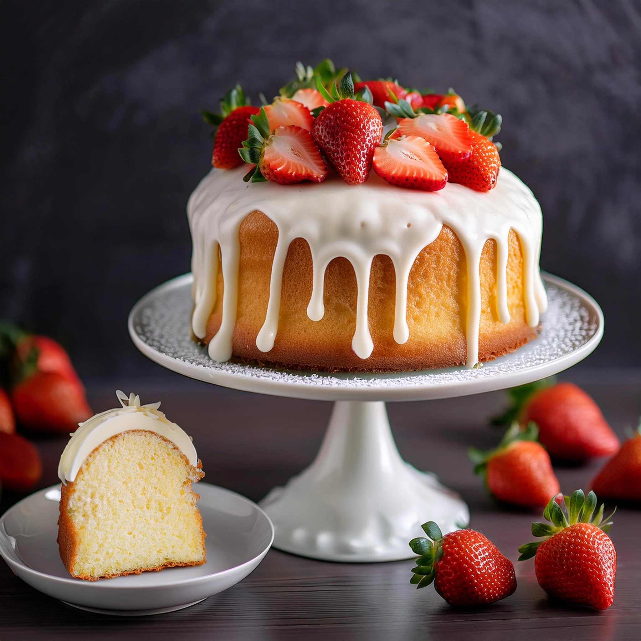 a fluffy angel food cake, drizzled with a white glaze sits on a beautiful cake stand with fresh strawberries around the base and a slice of the cake on a plate with some strawberries and a scoop of vanilla ice cream