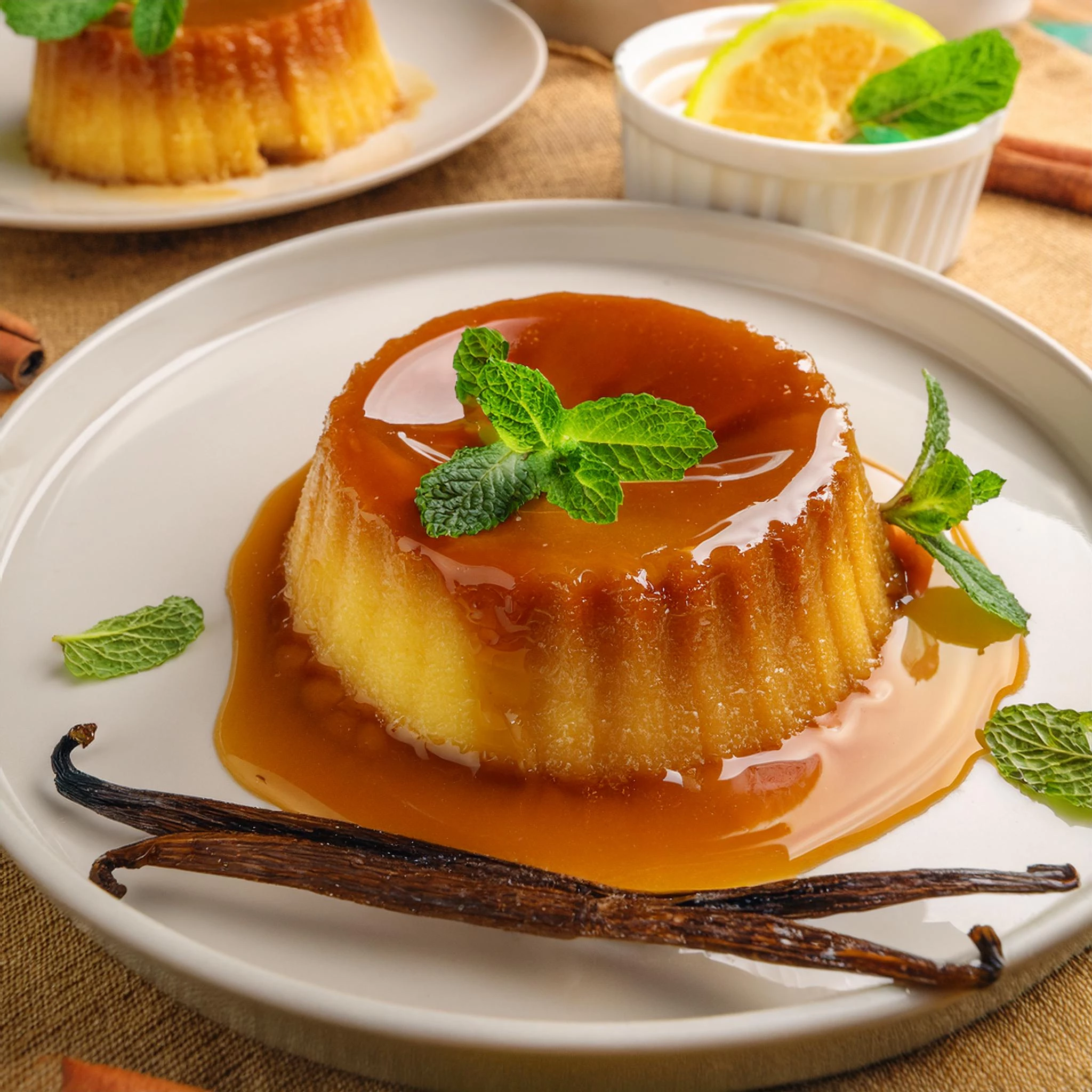 Foto realista en primer plano de Budín de pan hecho en un molde savarín ranurado, desmoldado sobre un plato blanco con bode dorado, bañado en mucho caramelo líquido y adornado con hojas de menta, ralladura de limón y vainas de vainilla. Sobre una mesa adornada el estilo elegante.