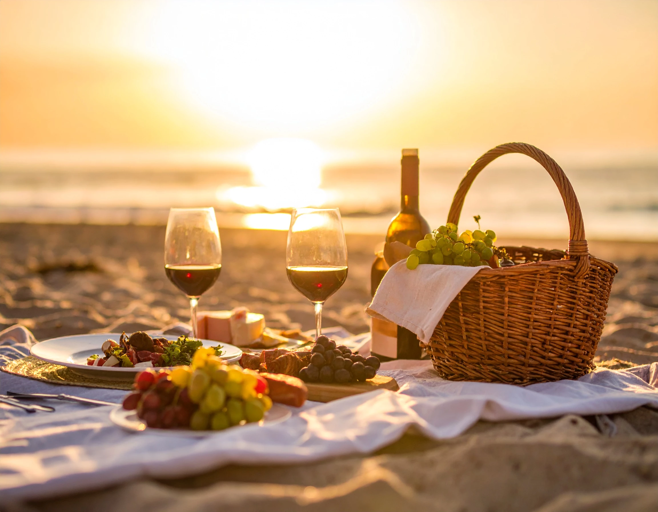 Having a picnic date on the beach as the sun sets behind you