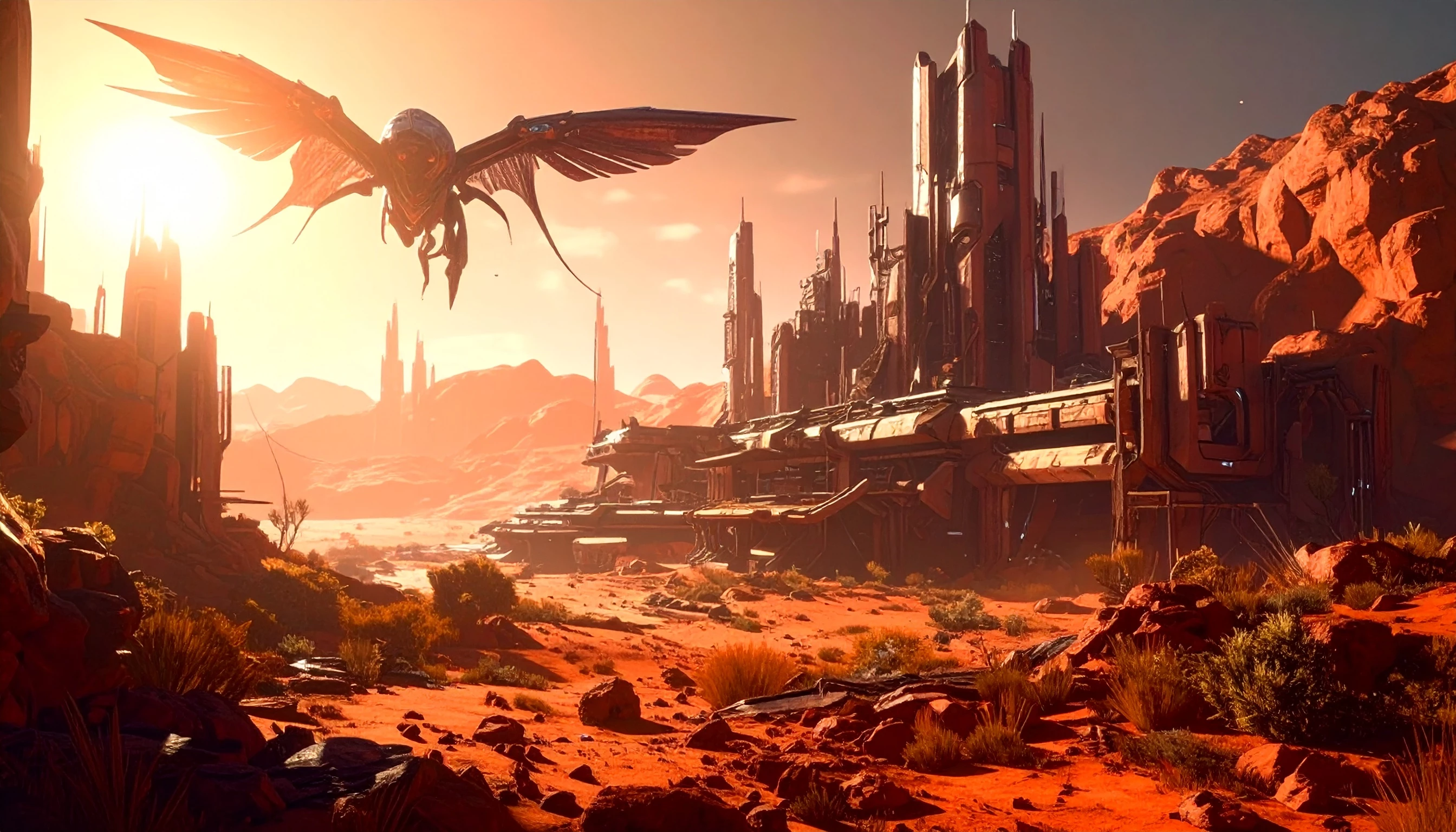 Golden hour from Mars, an abandoned Martian city in ruins, its angular and translucent buildings partially buried under red dust, bathed in golden light filtered through a thin atmosphere, torn cables floating in zero gravity and sparse alien vegetation growing between structures, a post-apocalyptic and nostalgic atmosphere, with a hybrid alien creature flying gracefully across the scene, its wings spread wide and casting a long shadow,, 3D style, 3D modeling with Blender, PBR textures, global illumination simulating Martian golden hour, final render using Cycles with light volumetrics