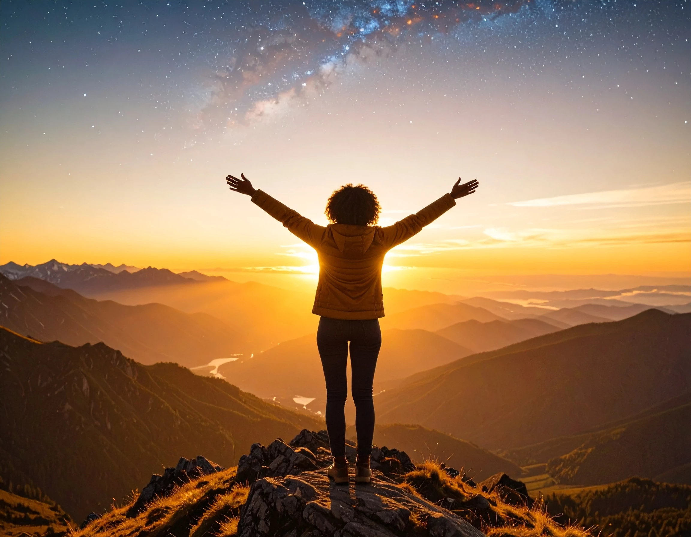 Prompt: Please create an image of the top of the mountains sunset time. A person standing on the peak putting their arms in the air and looking up at the golden, yellow orange sky with golden stars in the sky.