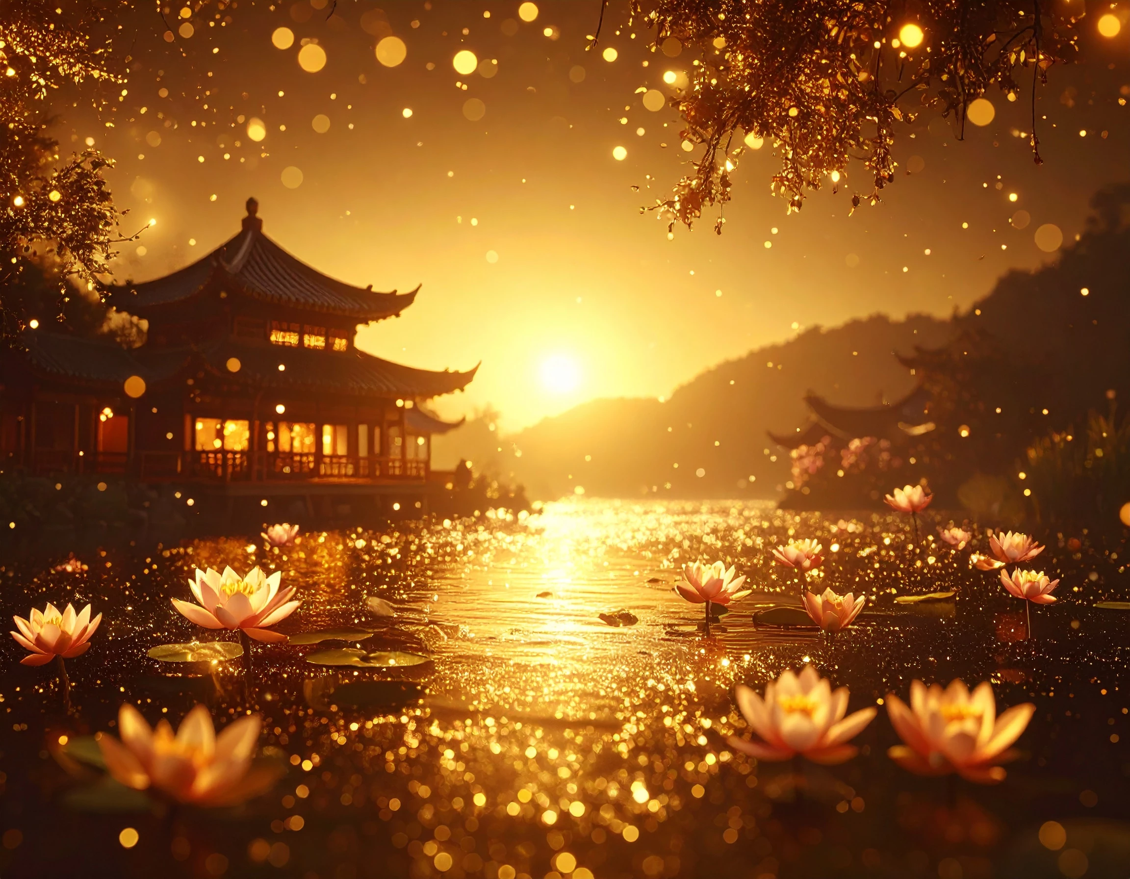 Prompt : magic of the golden hour on a Japanese riverside scene with lotuses.