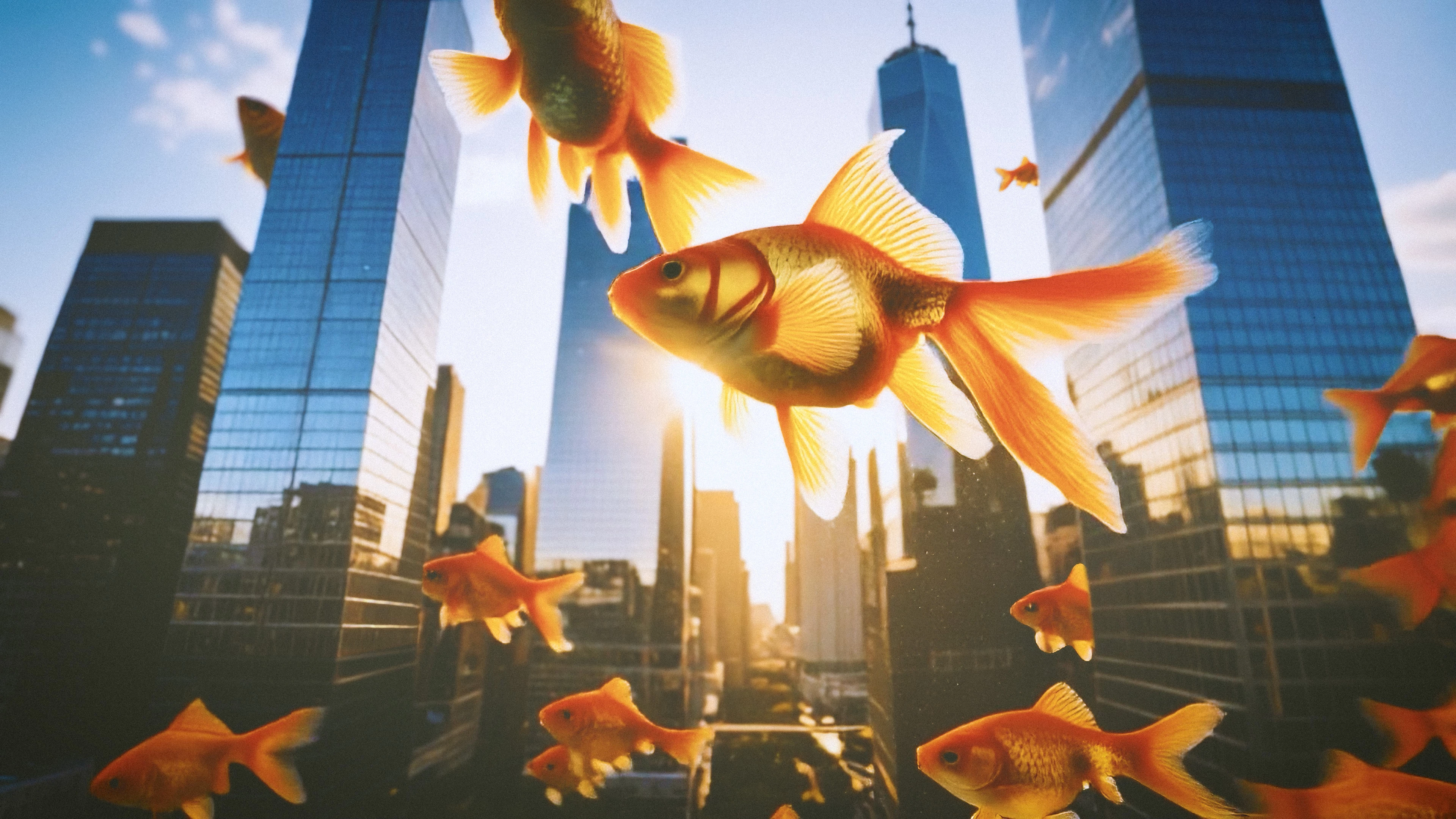 Goldfish swimming through the sky scrapers of New York City at sunset