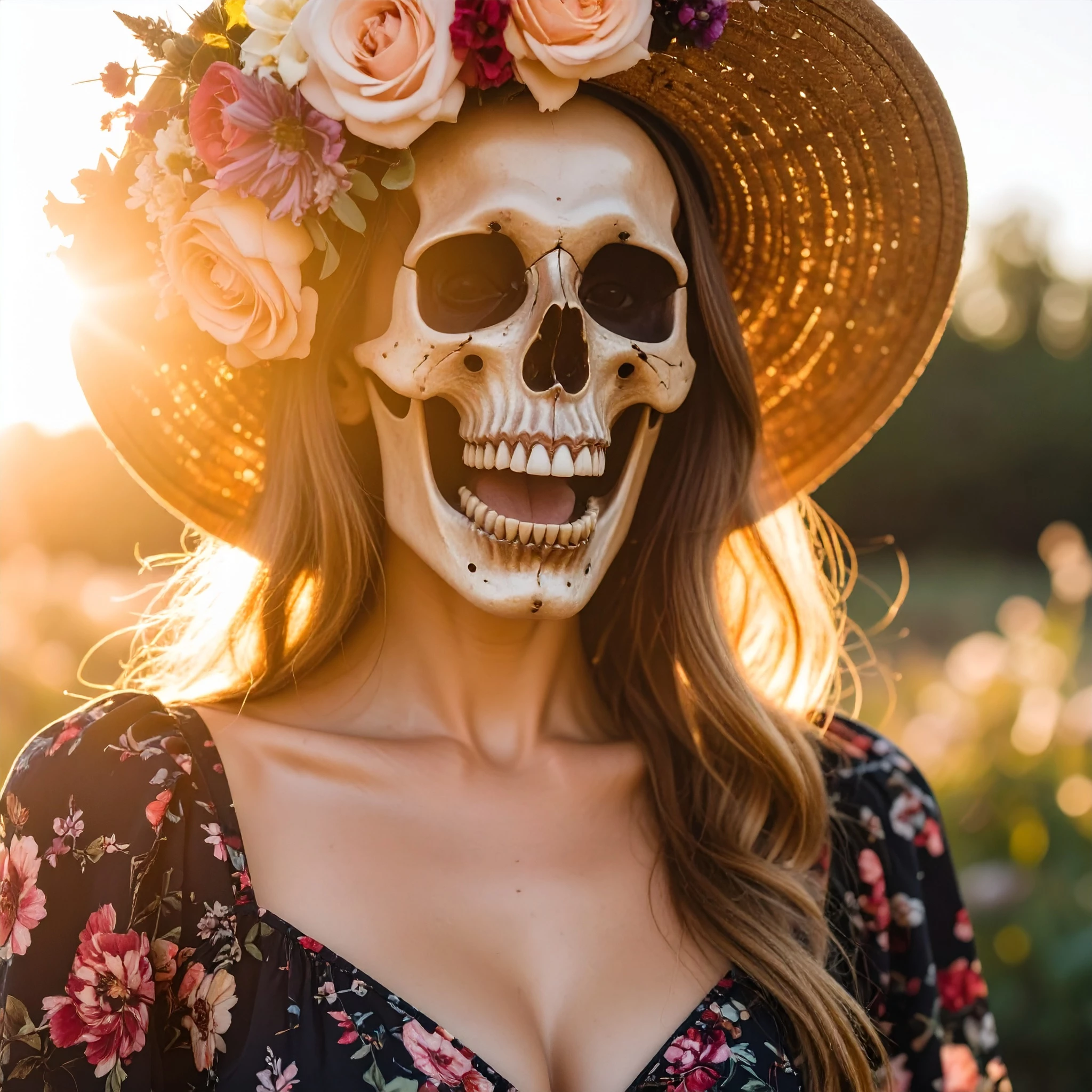 hyperreal photograph of a women wearing a fresh flower hat and floral dress, her skull is exposed with bone and grinning teeth, golden hour light, fashion horror photography