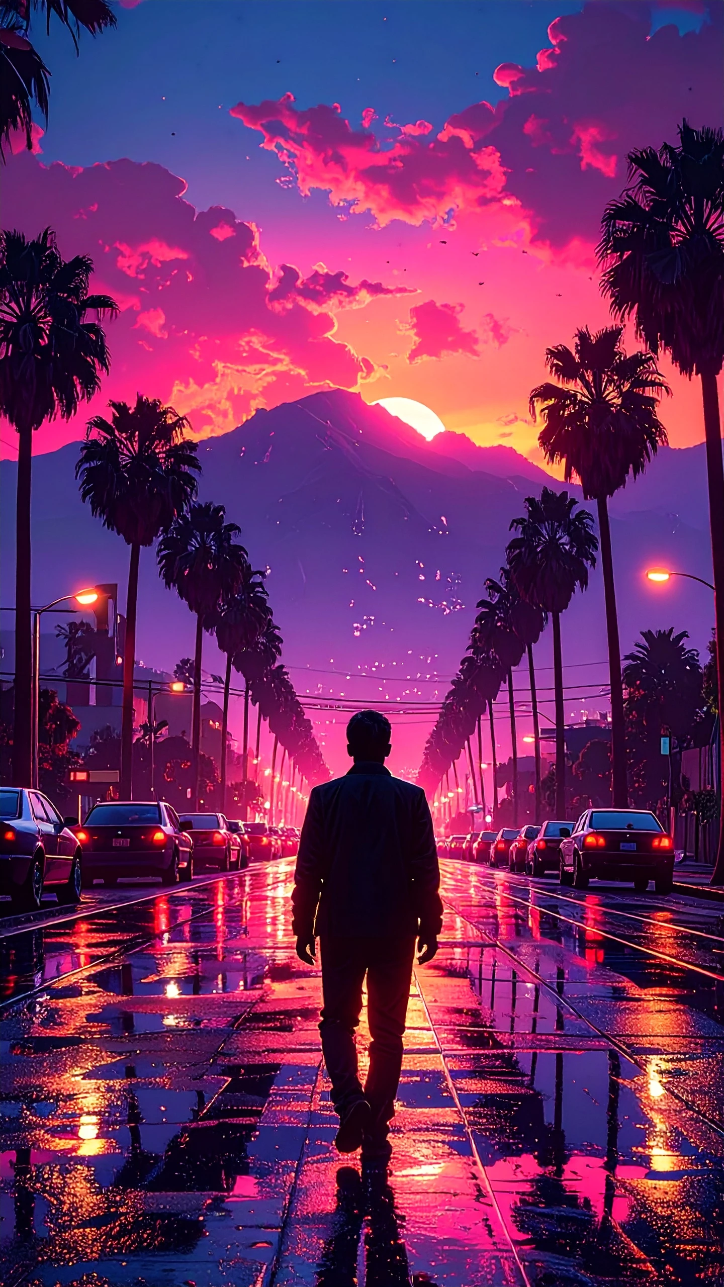 Ultra-detailed cinematic street scene at sunset, palm-lined avenue in Los Angeles, retro '80s aesthetic, wet asphalt reflecting a neon pink and orange sky, dramatic clouds, central perspective at one point, vintage cars parked on both sides, dark silhouette of a man seen from behind walking in the middle of the road, streetlamps lit, silhouette of mountains in the distance, synthwave color palette, high-contrast lighting, photo-realistic style, dreamlike, surreal atmosphere, low-angle, wide-angle shot