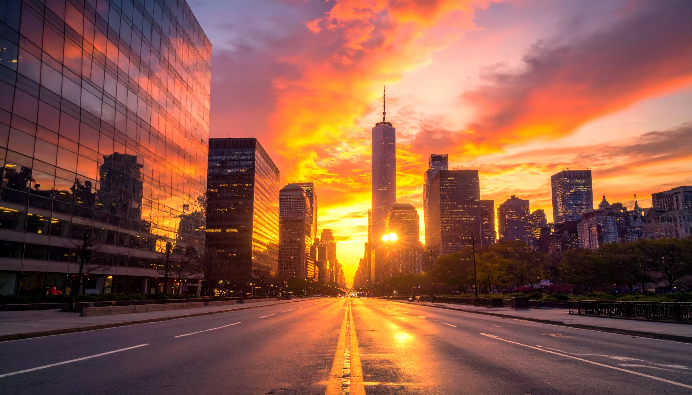 Street-level view of a large city like New York during golden hour. The perspective looks down an empty avenue lined with towering glass skyscrapers. The sky is intensely vibrant, painted with fiery oranges, deep reds, and glowing gold, radiating a magical, almost surreal energy. Warm sunlight reflects dramatically off the glass buildings, while the lower parts of the city remain in deep shadow, creating a striking contrast between the glowing sky and the darker urban environment. The empty streets feel hauntingly quiet, evoking solitude amidst the beauty of the sunset. Cinematic, artistic, moody, glowing reflections, dreamy atmosphere, vibrant sky, soft yet dramatic lighting.