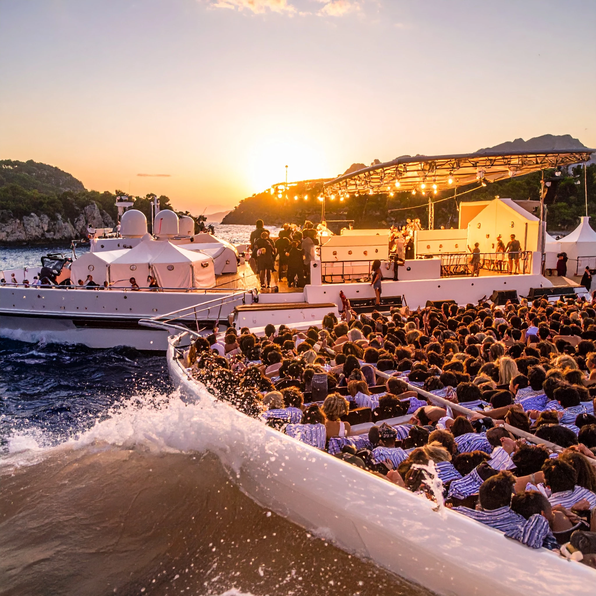 genrate an image of golden hour at a music concert on a super big and luxurious yacht, image is taken from the top