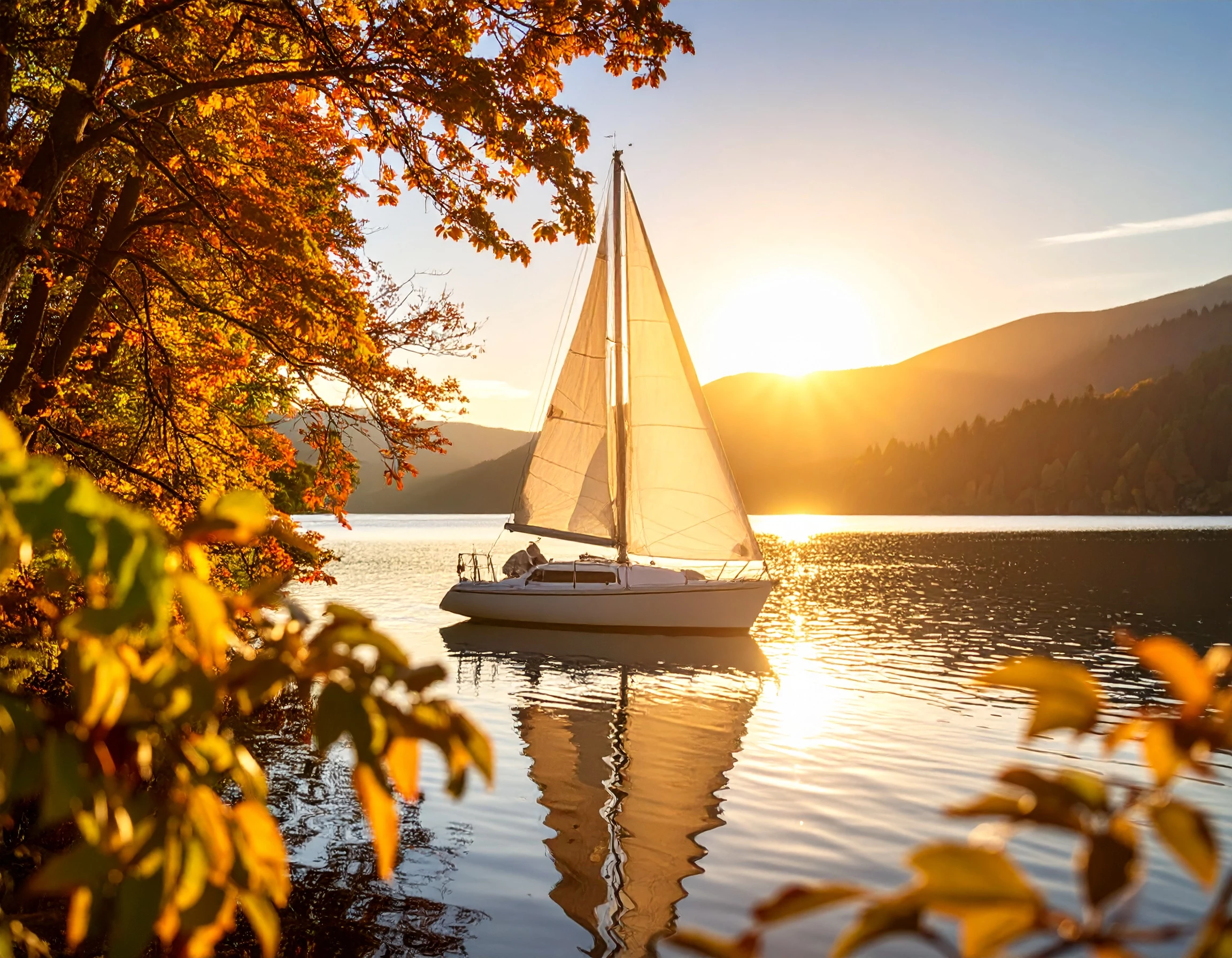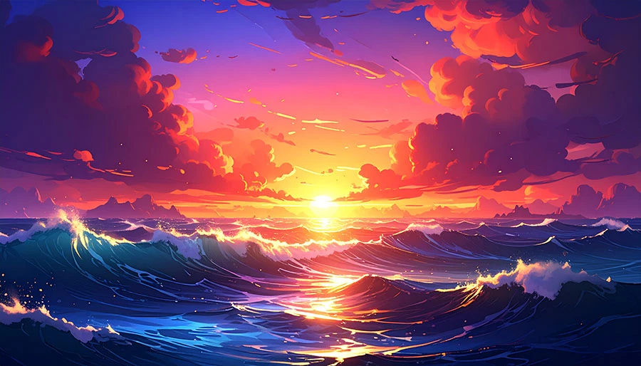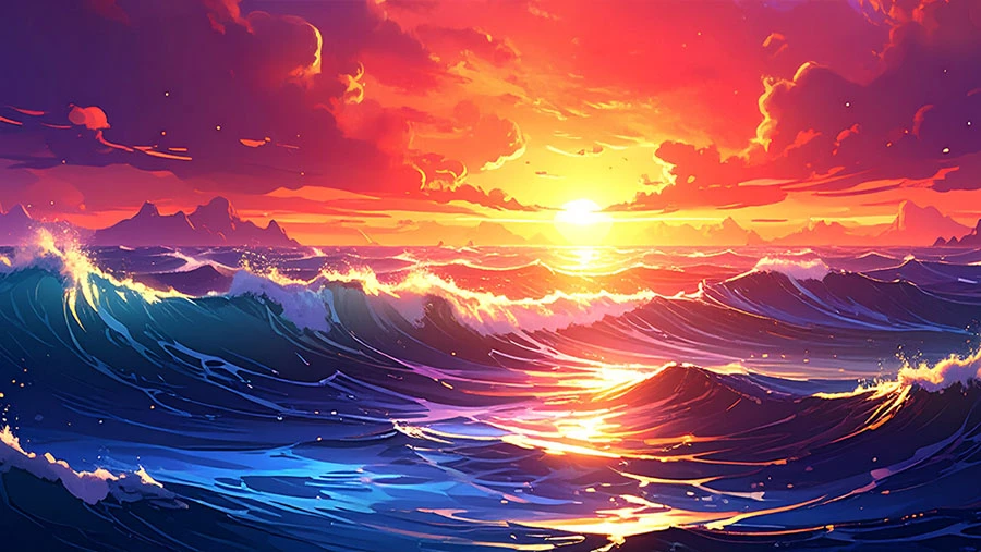 Prompt: A golden sun dips toward the horizon, spilling molten light across the rippling sea. The sky, ablaze with colour, melts from deep indigo to rose-gold, each cloud edged with a glowing fire that flickers like magic.
