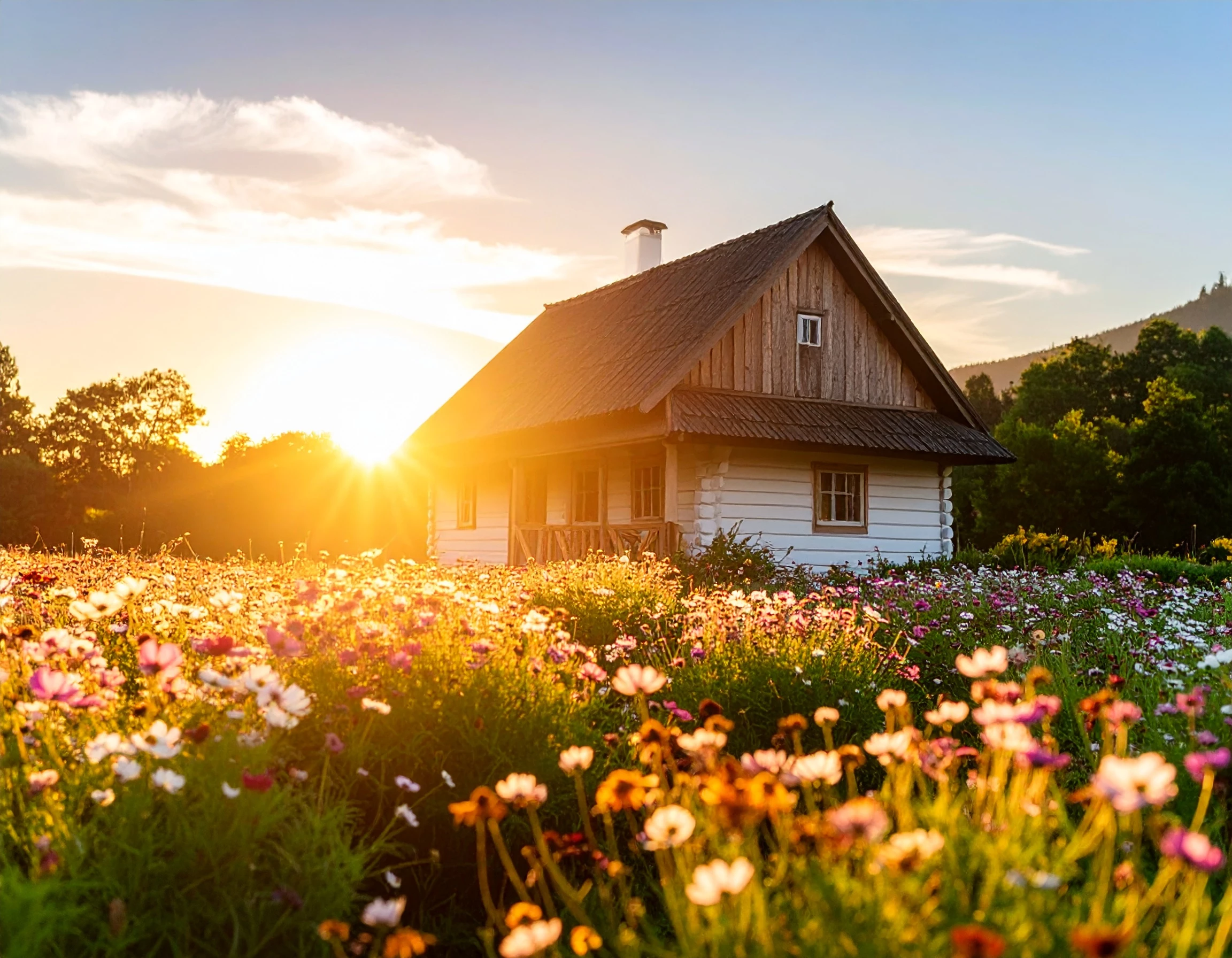 Prompt: golden hour in a colorful flower field with a light-colored vintage wooden cottage