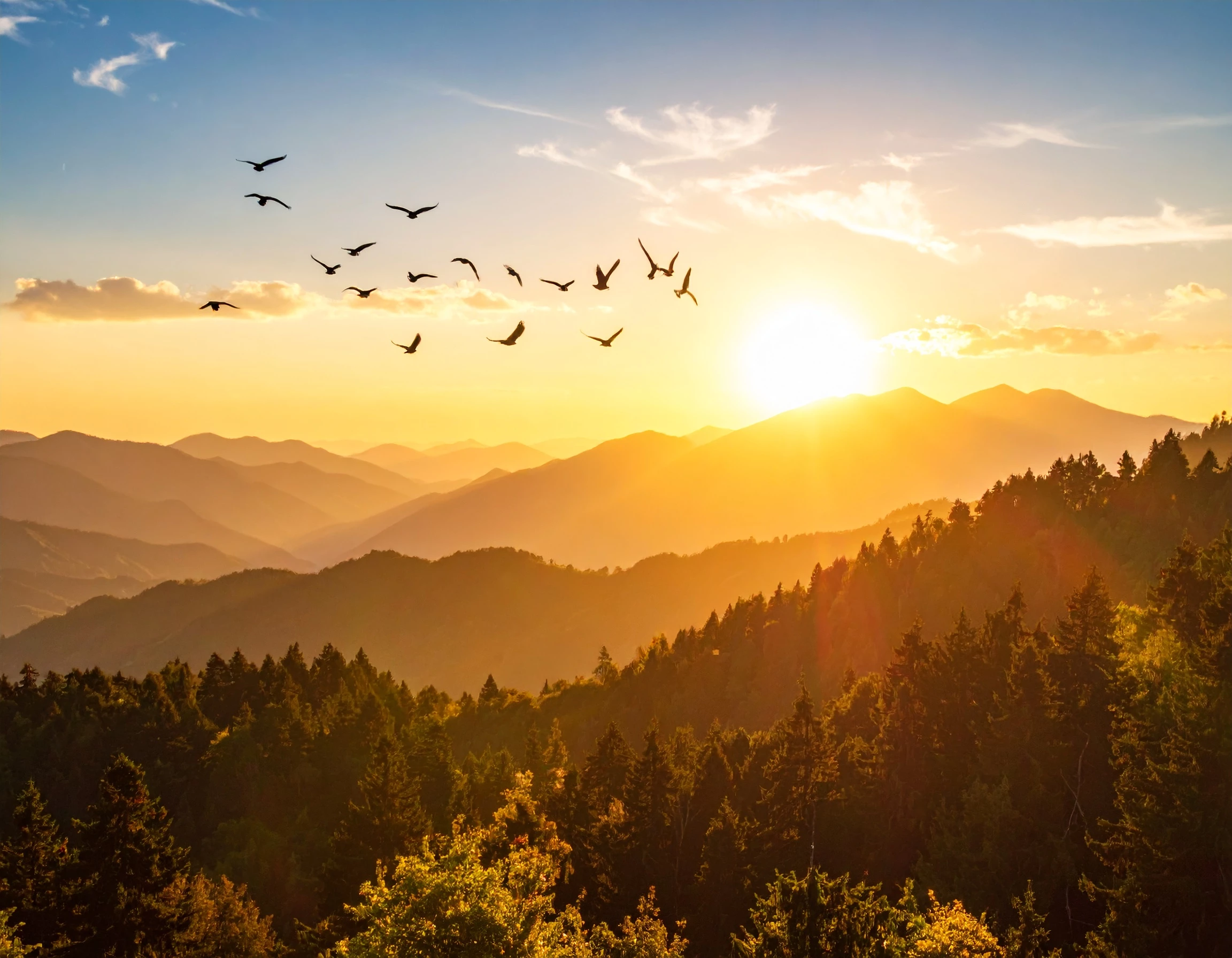 Prompt: bird's eye golden hour mountain view with lots of trees and birds