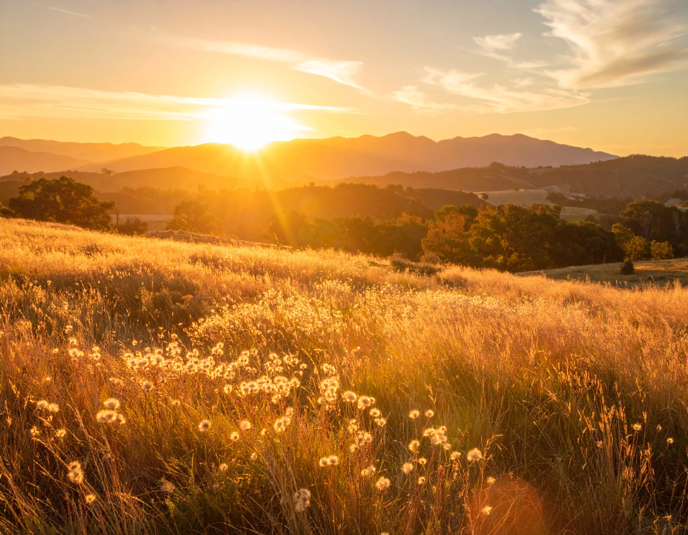 prompt: golden hour sunlight, soft warm glow, dreamy atmosphere, long shadows, glowing sky, peaceful landscape, cinematic lighting, pastel tones