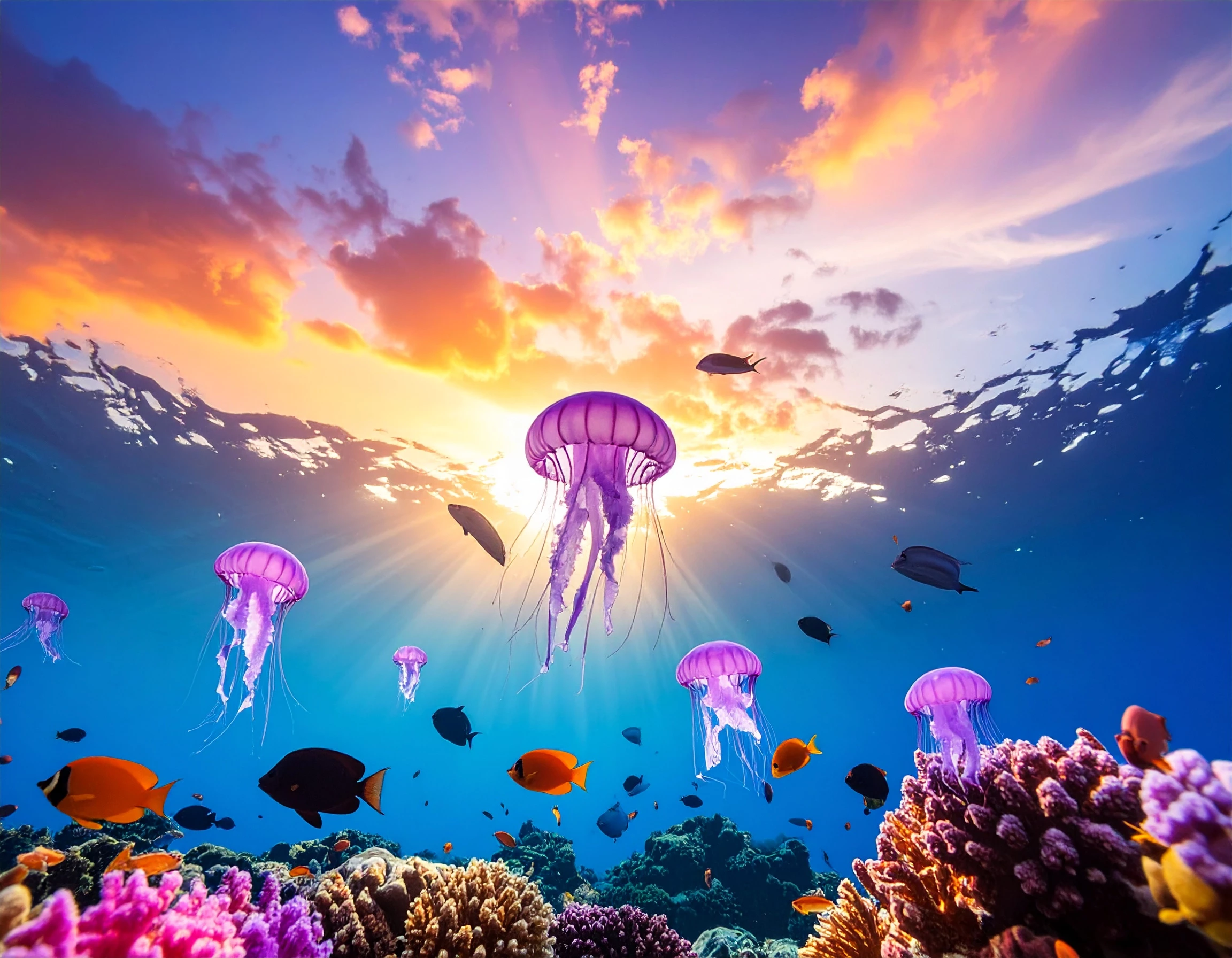 Prompt: Beautiful golden hour sky with deep blues, purples, pinks, and oranges showcasing a fantastical scene with fish and jellyfish floating in the sky