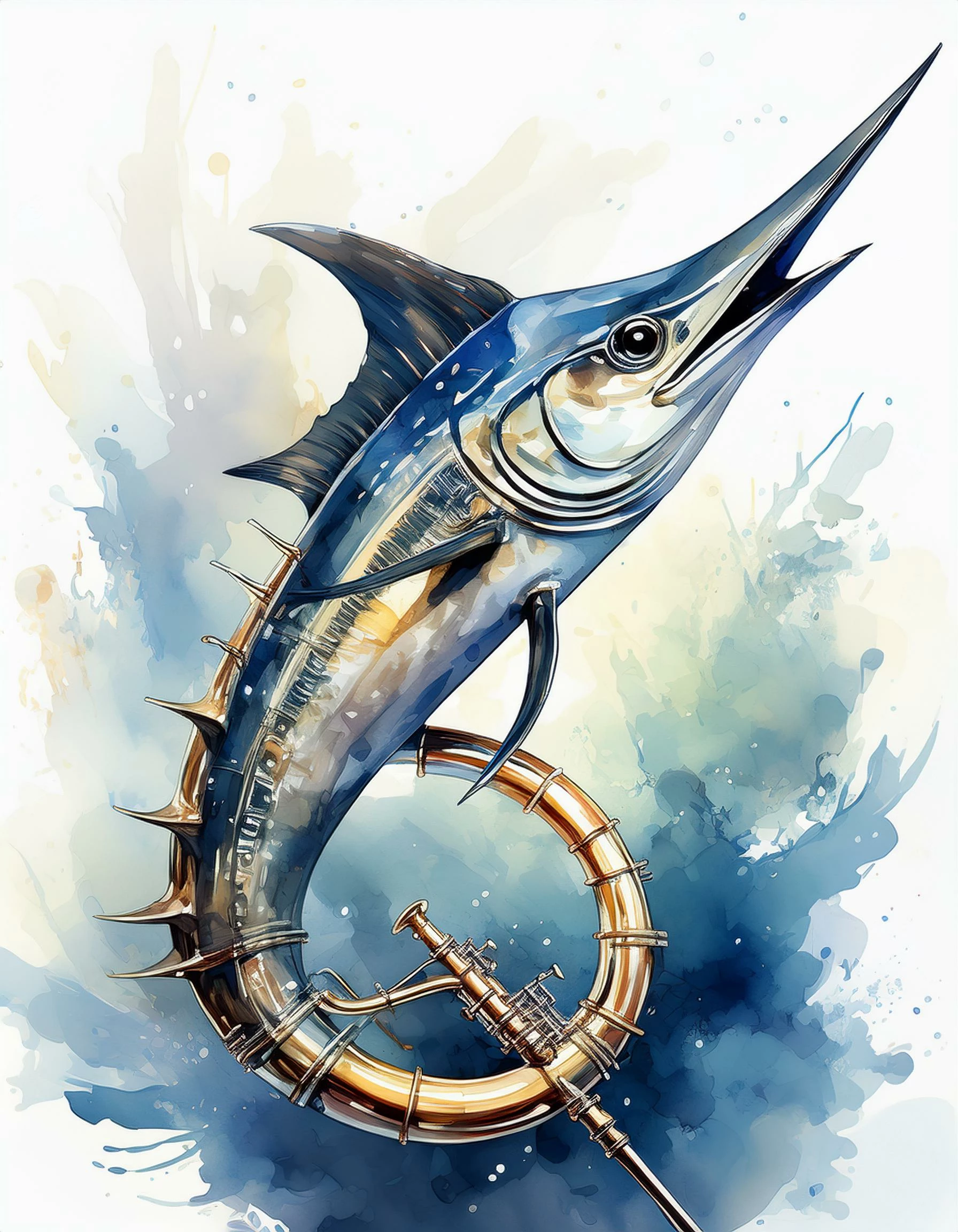 Prompt: A poster of a swordfish trombone, use negative colours; fishy game; artistic watercolor illustration
