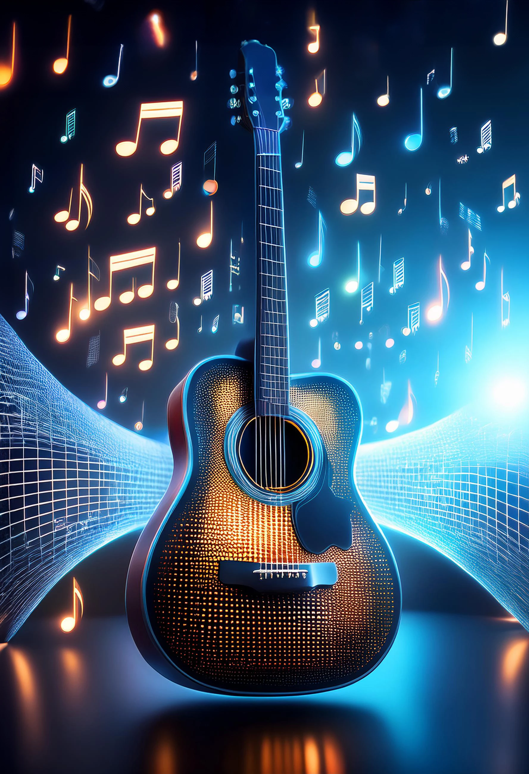 A beautiful futuristic acoustic guitar with a surreal background and musical notes floating in the background.