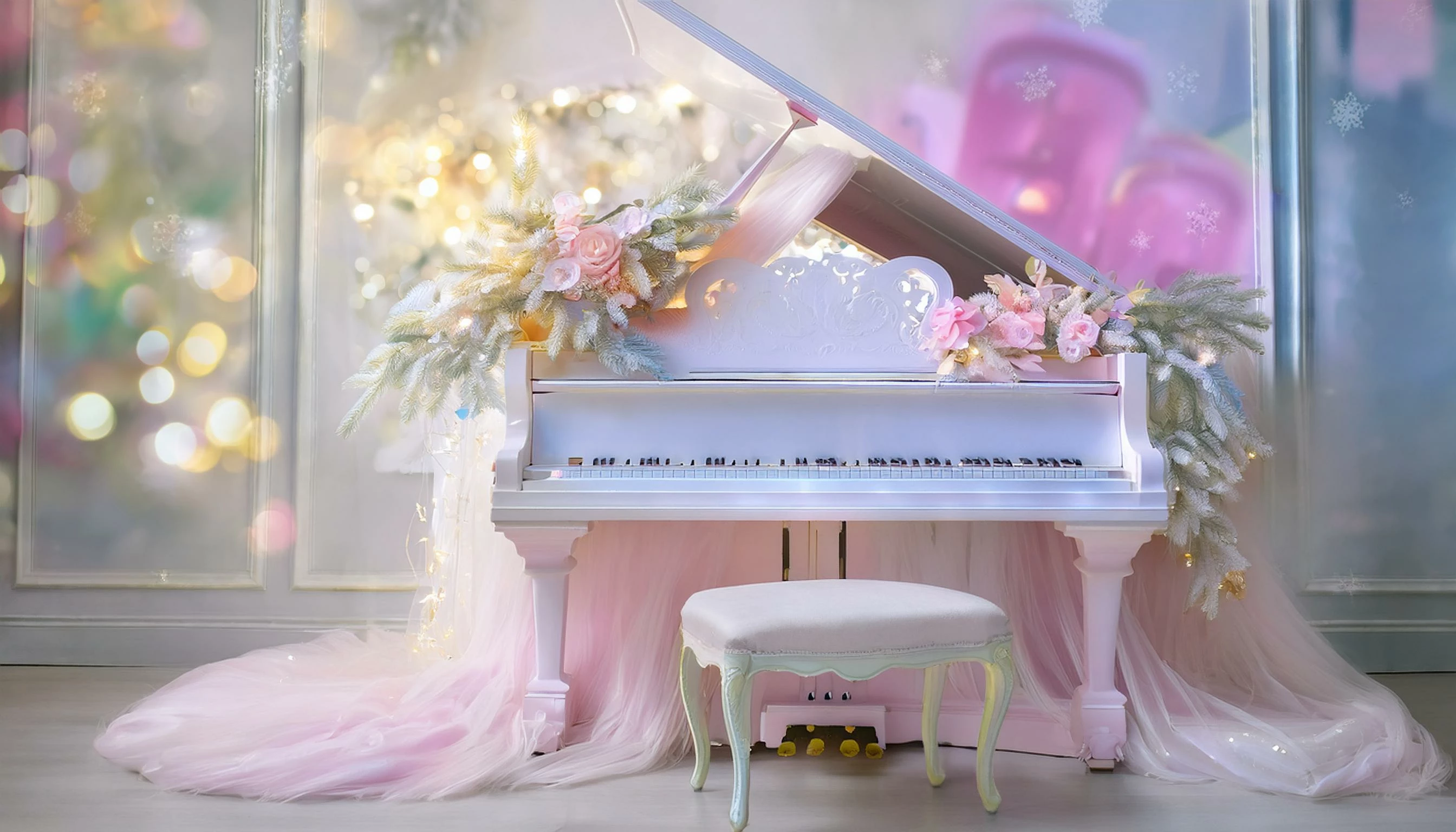 light pink baby piano on a white background with colored lights shining softly in the background, reflecting on the piano. pastel colors, soft mystical vibe.