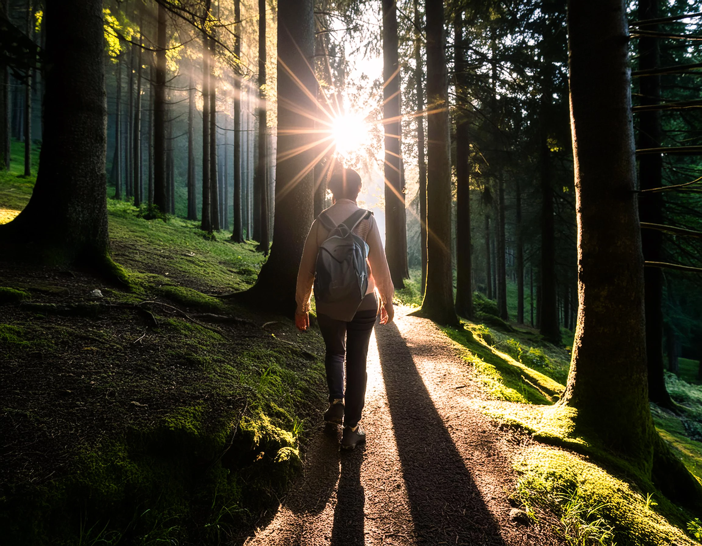 "Walking in a sunlit forest"