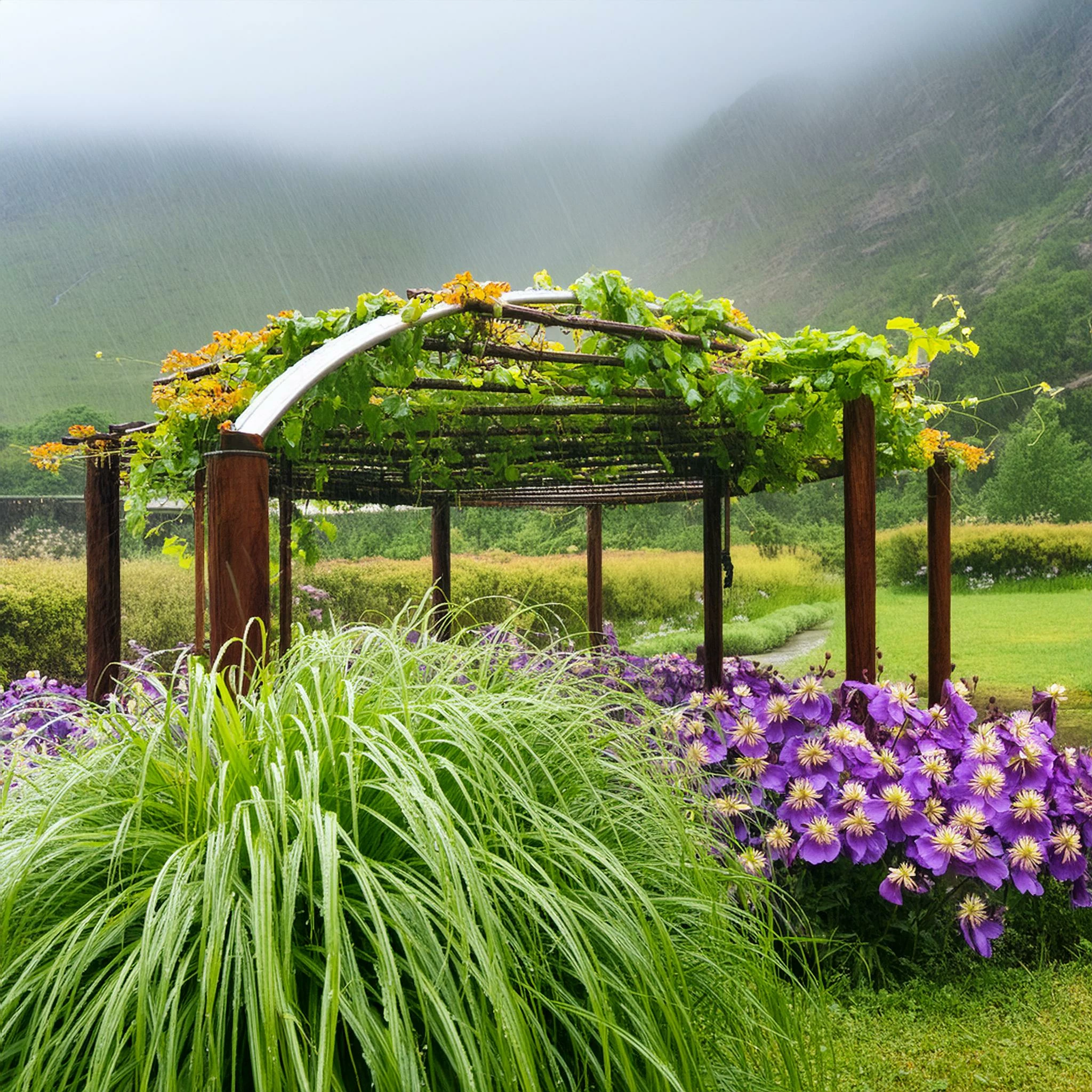 Stylize idealistic view of my submerged ecological garden (with wadi and pergola) since.... October 2023 due to eternal Belgian rains: