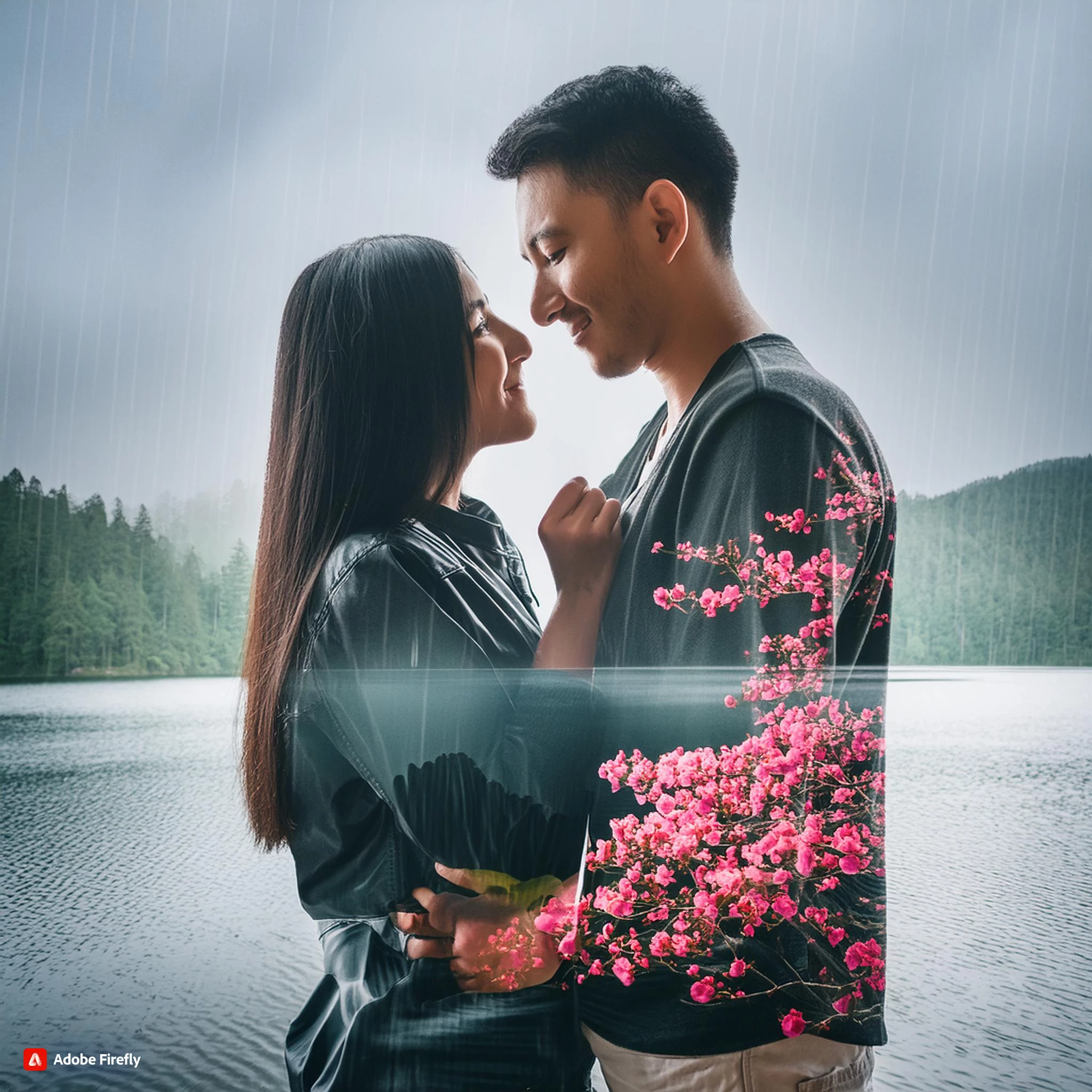 My prompt: a double exposure in serene scenery of northern sky in a rainy weather,cherry blossoms tress, sillouthe couple in romantic gestures.