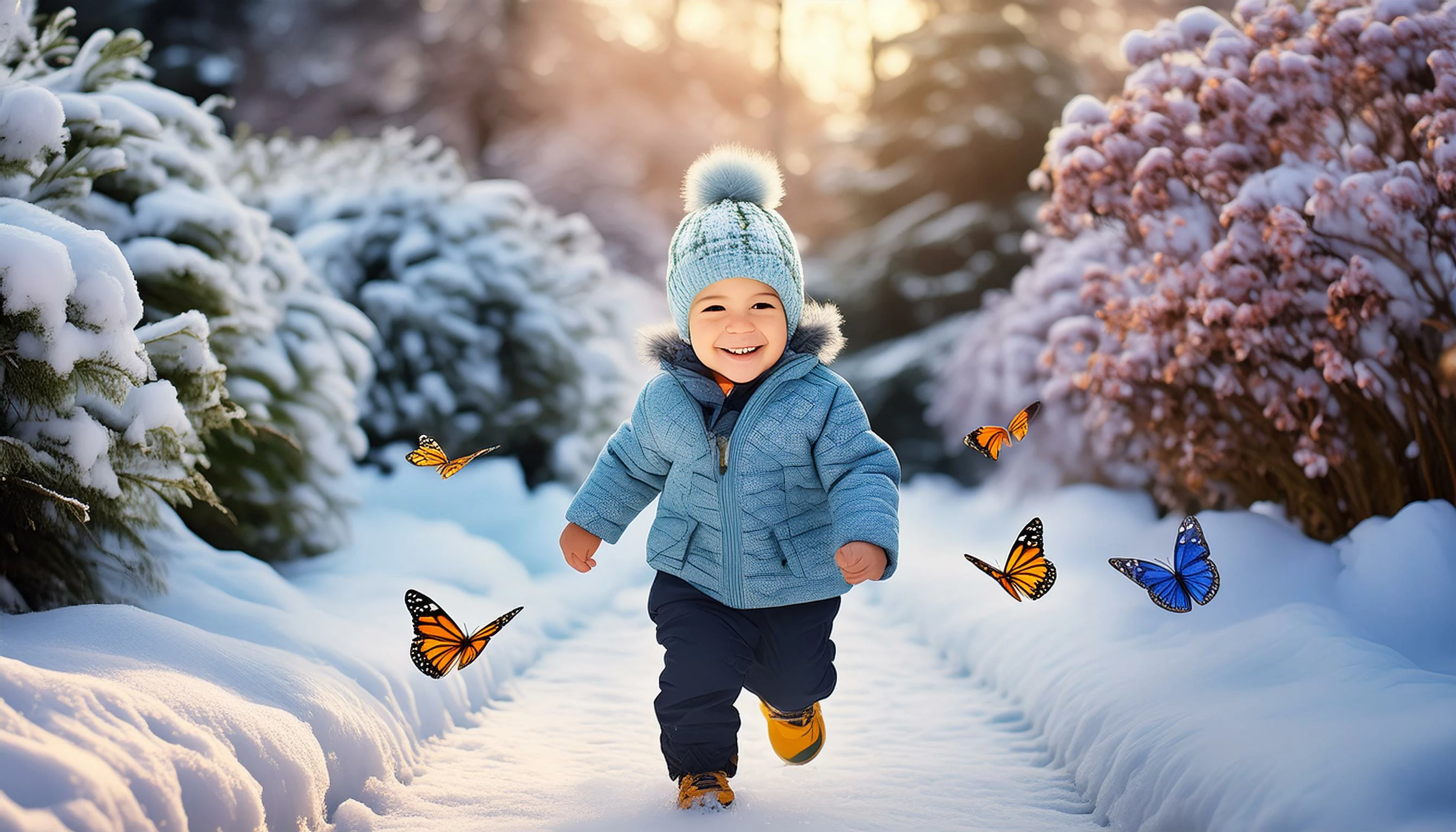baby boy running after butterfly in snowy garden