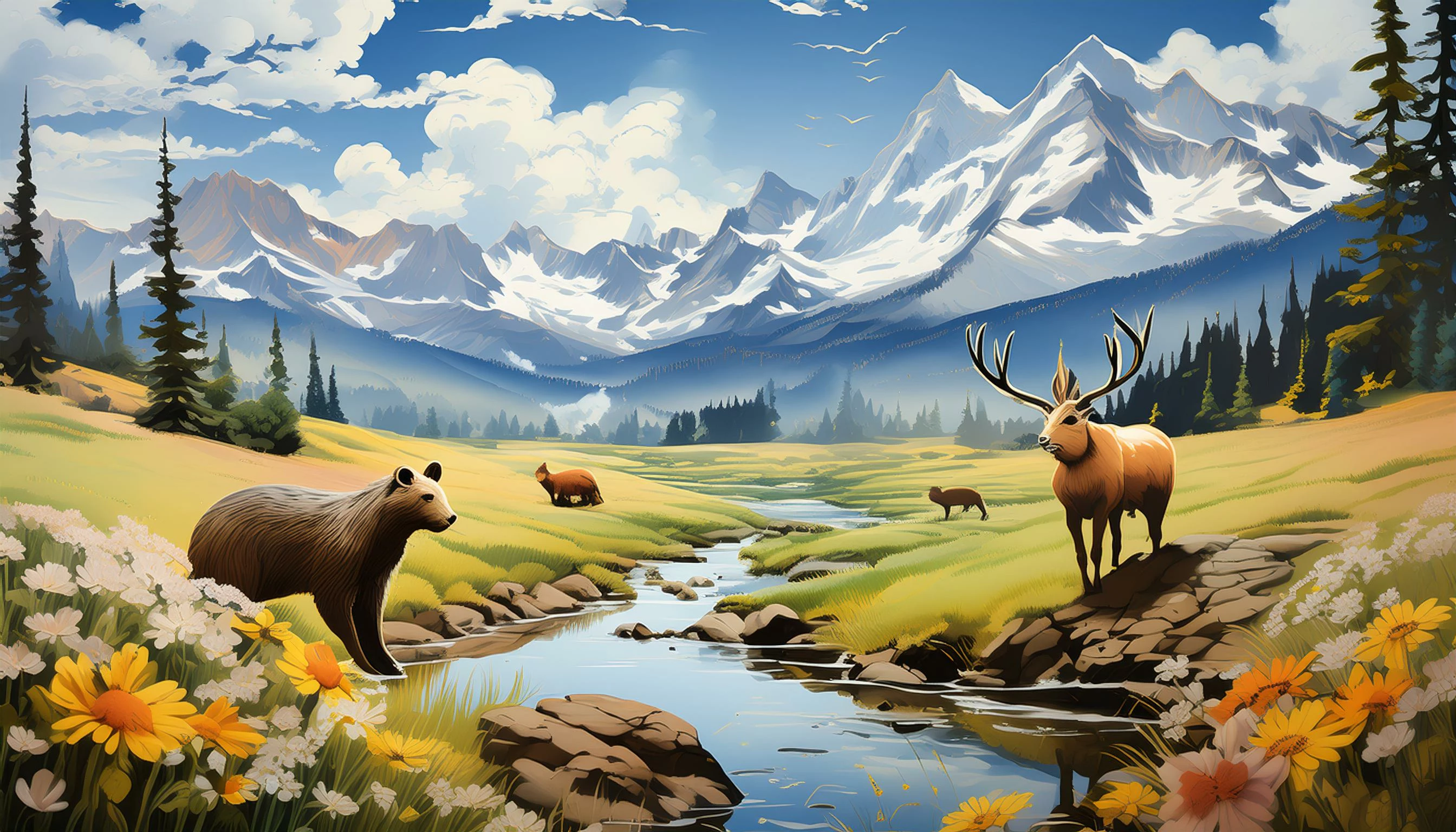 Create an illustration of a serene Colorado summer scene. Picture snow-capped mountains in the background, a gentle stream winding through the meadow, dotted with vibrant wildflowers. In the distance, observe various animals: a rabbit hopping near the water's edge, an elk grazing peacefully, a pika perched on a rock, a chipmunk scurrying between bushes, and a marmot basking in the sun. Capture the essence of nature with a bear calmly roaming amidst this picturesque landscape.