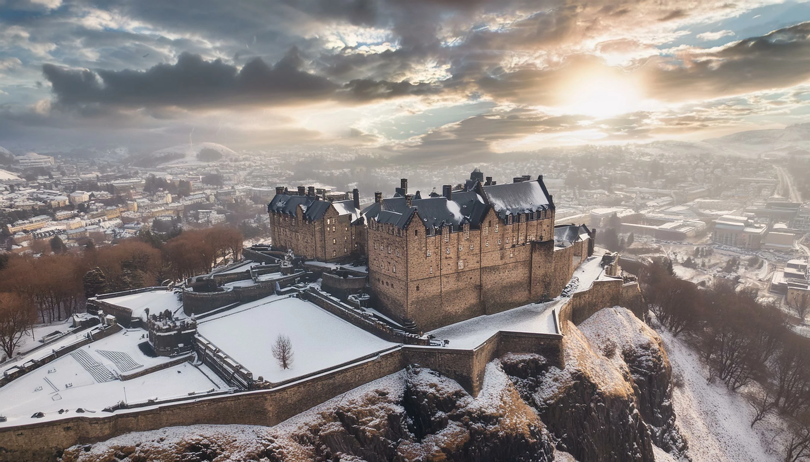 A beautiful aerial view of edinburgh castle in scotland winter with dramatic clouds