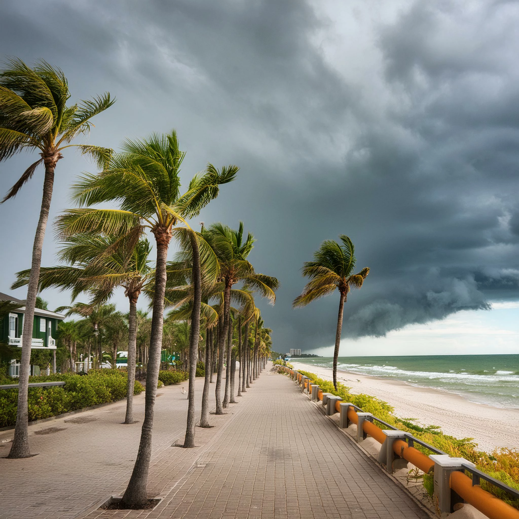 A Florida Beach with palm trees, and storm clouds over the water