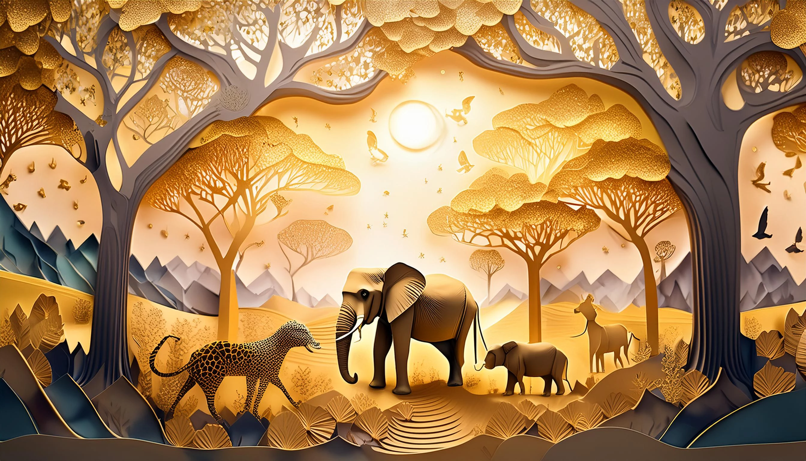 A sunrise is casting a golden glow over the majestic peaks.