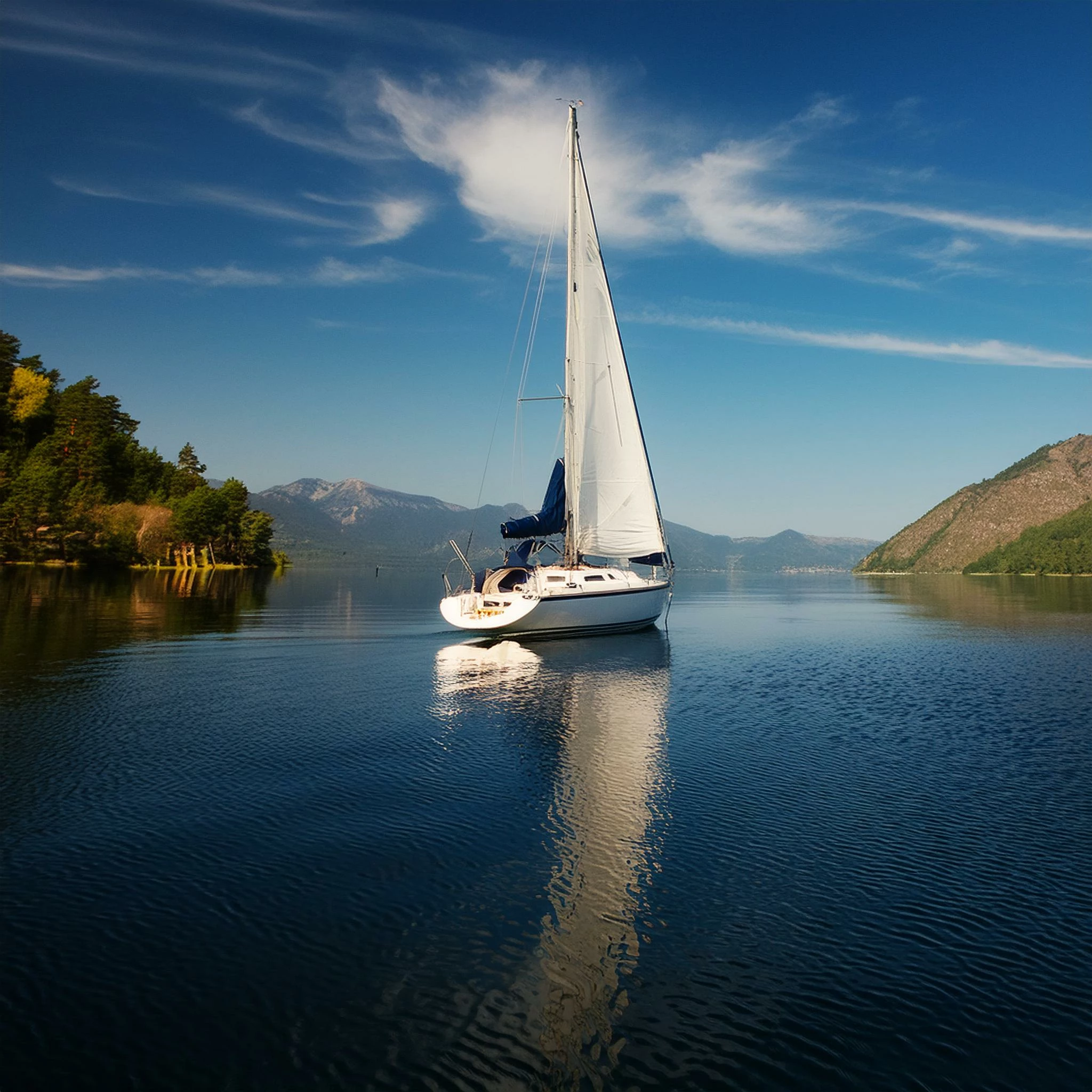 sailboat on a calm lake with a bright blue sky and mountains in the background