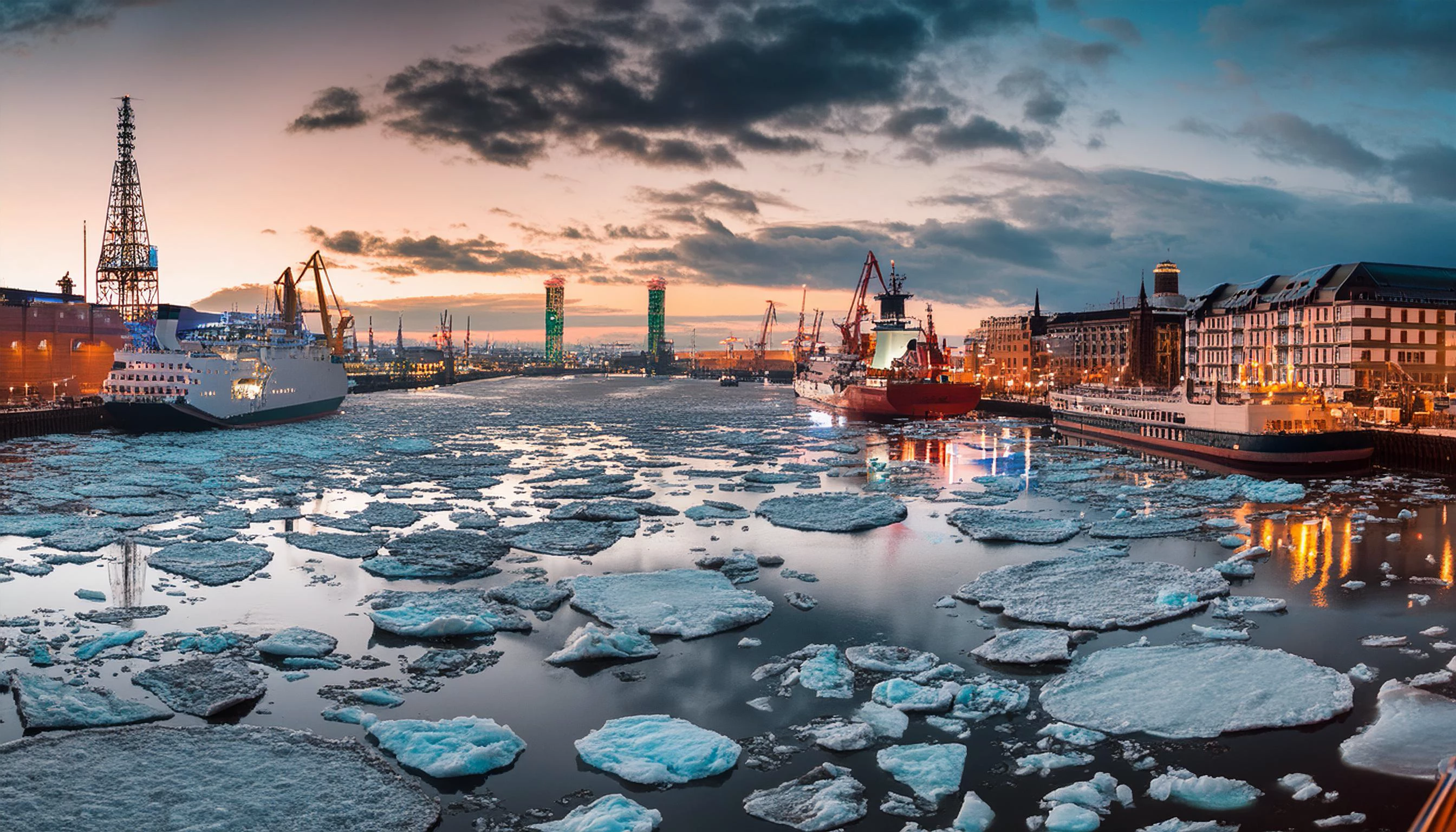 Hafen hamburg mit sehr vielen dicken eisschollen und schiffen und Fähren, die hindurchfahren. Elbphilharmonie, in der dämmerung, blue hour dramatische wolken