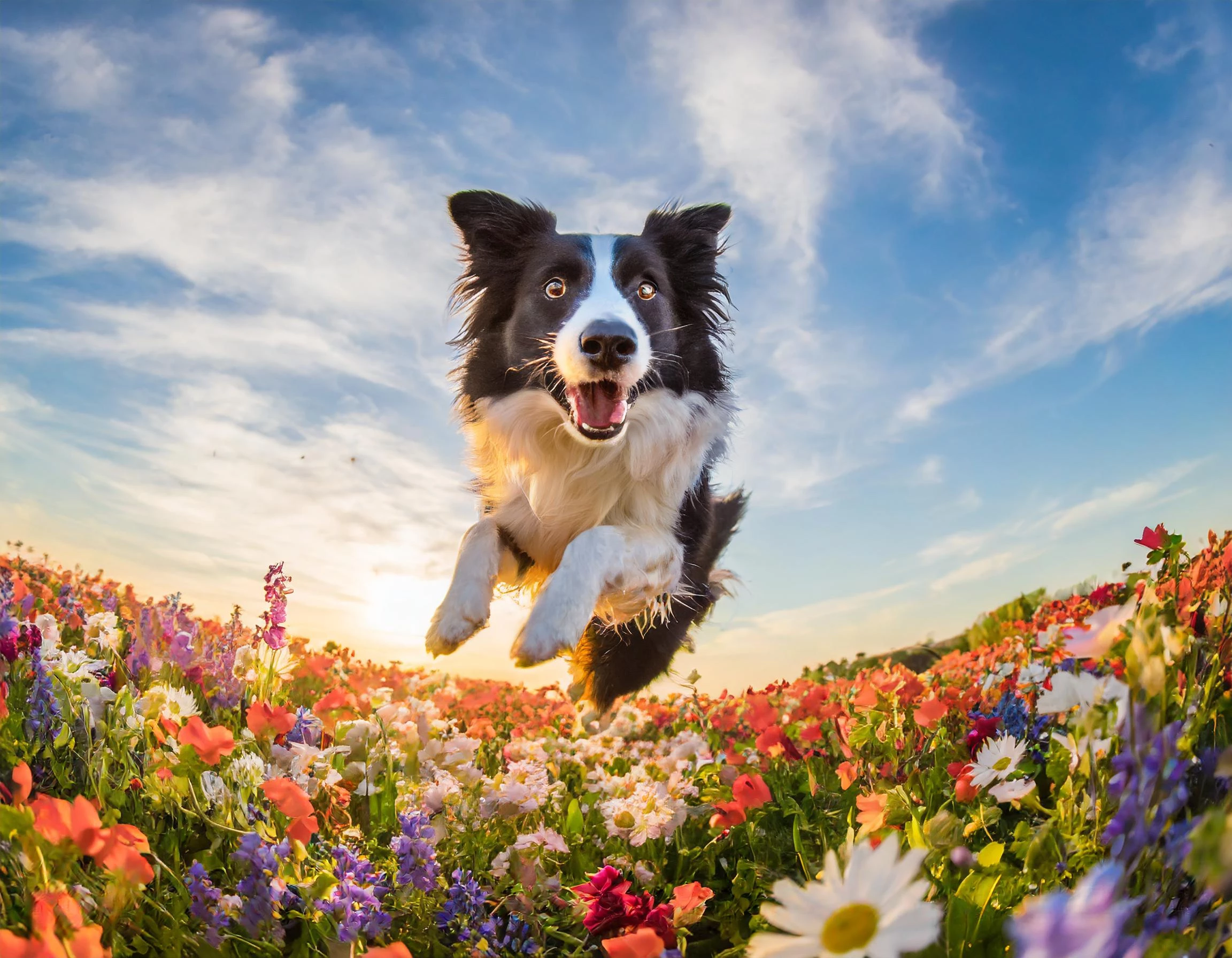 Border Collie jumping in the middle of a flower field full of multi colored flowers, spring, blue sky, golden hour