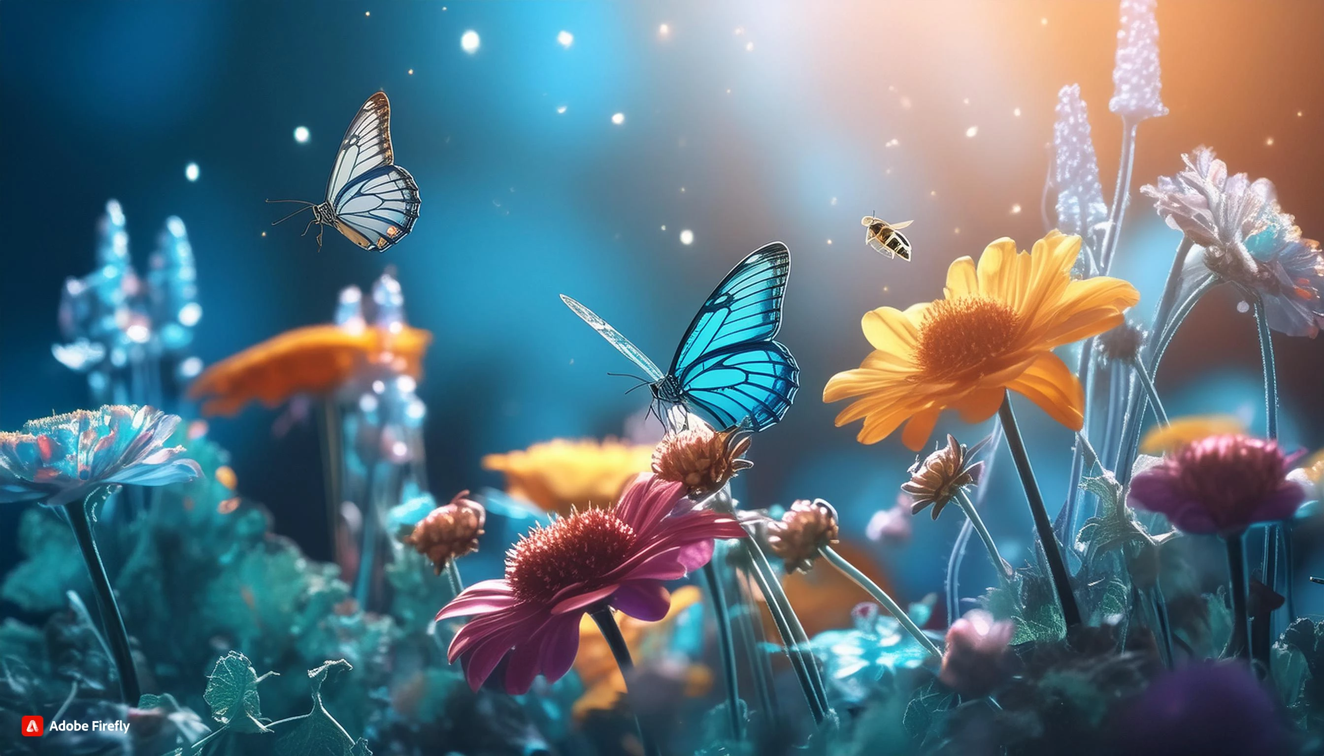A vibrant garden bursting with colorful blooms, butterflies fluttering among the flowers, and bees buzzing around.