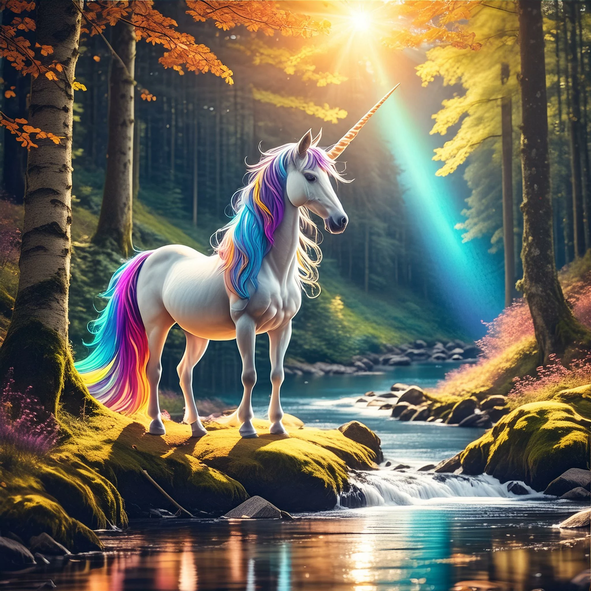 I used this prompt in Firefly: "A whimsical unicorn with a rainbow mane standing beside a sparkling river in an enchanted forest'