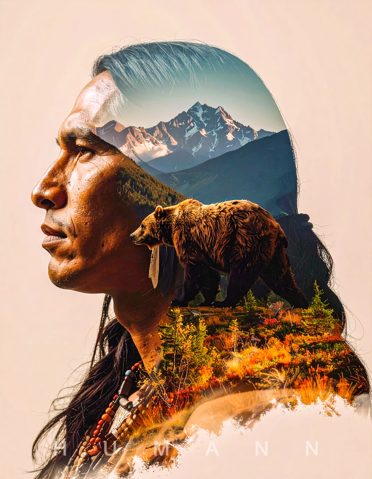 A high-detail double exposure illustration featuring the side profile of a Native American male as the central subject and main focal point, his facial features calm and strong, with long dark hair and traditional jewelry. Within the silhouette of his face, layered mountainous terrain and a large, powerful bear in mid-stride blend seamlessly, creating a harmonious natural scene. Soft, diffused lighting enhances facial contours and brings subtle depth to the landscape. The background remains minimal and softly blurred to maintain focus on the double exposure effect. The entire composition is rendered in rich earth tones—warm browns, ochres, muted greens, and deep stone grays—for an organic, soulful aesthetic and a cinematic, fine art style.