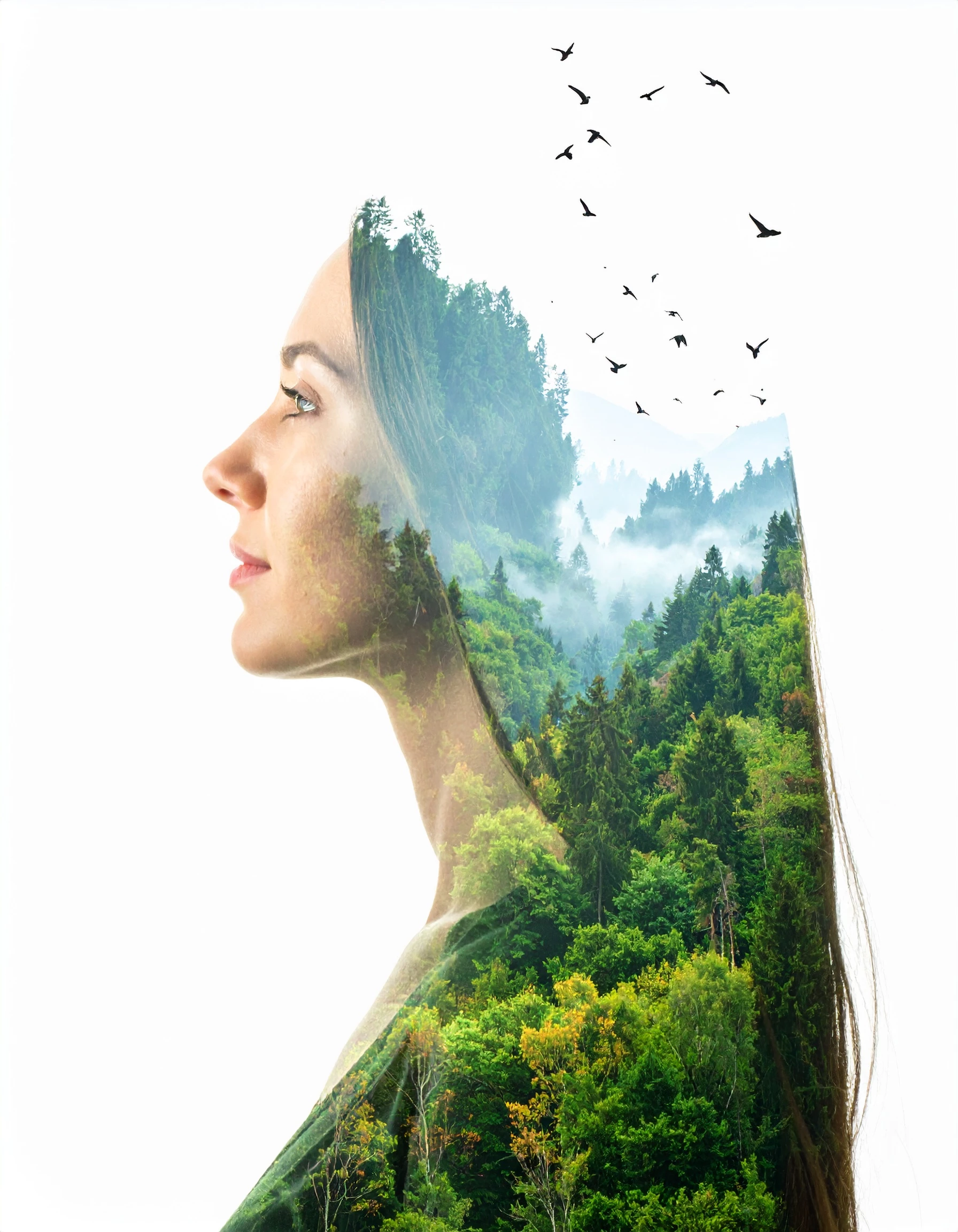 Prompt: a cinematic double exposure portrait of a thoughtful woman gazing sideways, her profile blending seamlessly with a misty forest at dawn. Incorporate soft lighting, ethereal atmosphere, and high contrast between subject and background. Use warm tones for the face and cool bluish-greens for the forest scene. The composition should be visually poetic, with subtle birds in flight fading into the subject’s hair. Ultra-realistic, moody, and emotionally evocative.