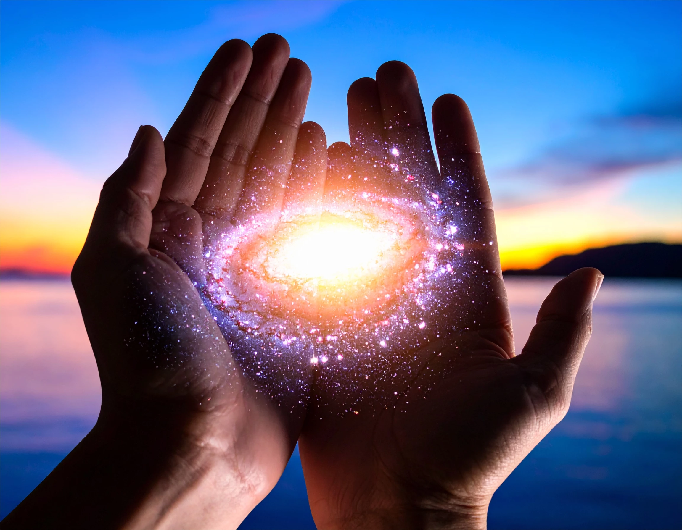 prompt: Double Exposure Concepts, The galaxy in the palm of hands spread out toward the blue sky.