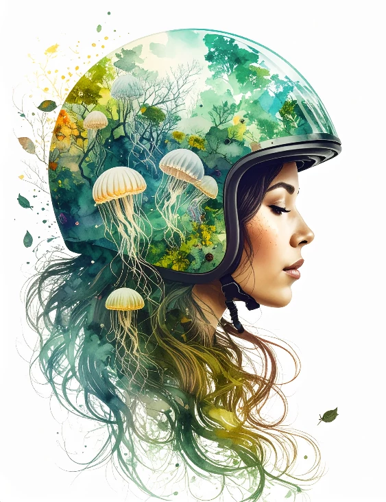 cinematic double exposure of woman wearing a motorbike helmet, pondering life, Jellyfish swimming around in the exposure, simple white background