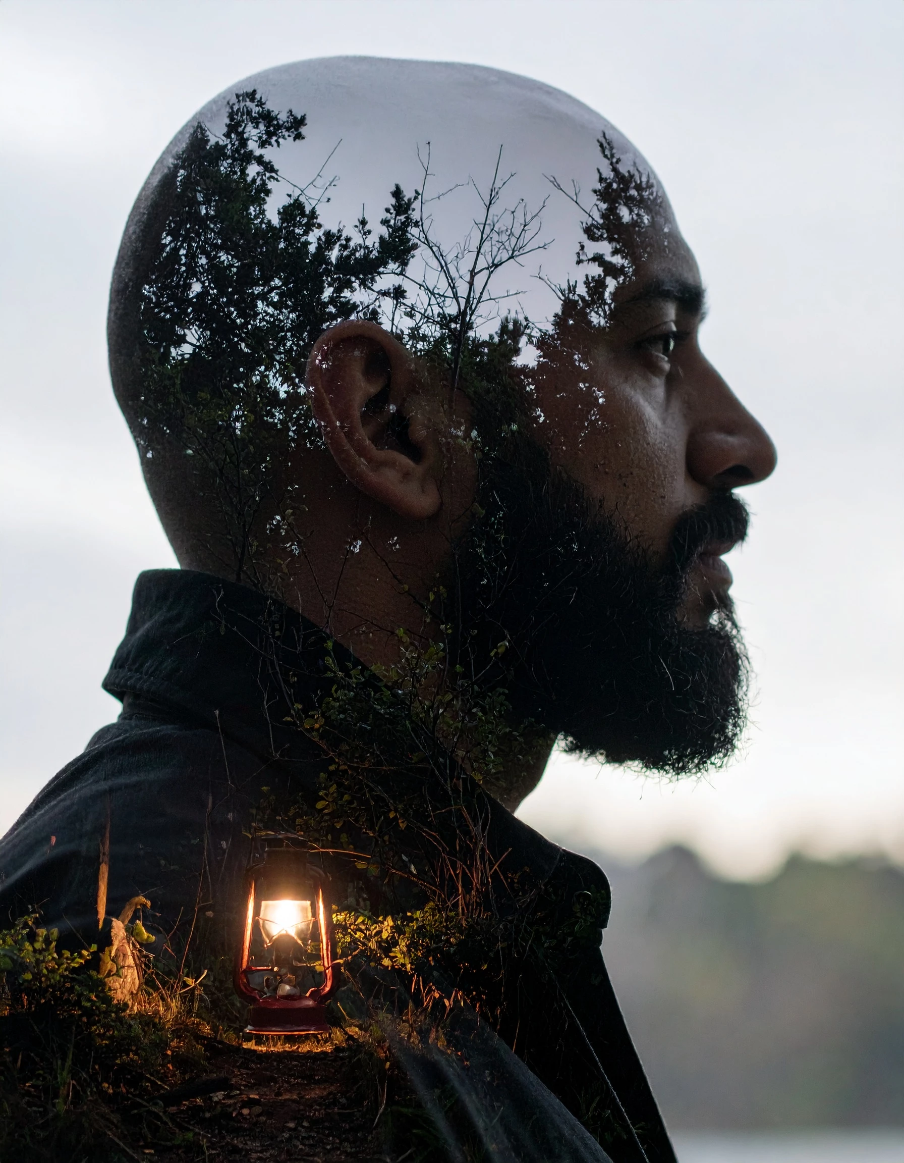 double exposure image of a silhouette of bald man with a full beard in side profile,  a dark forrest with a lantern