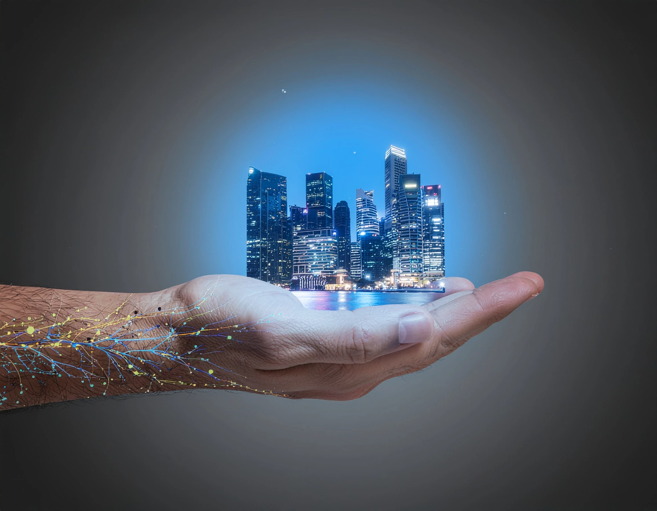 A photorealistic human hand shown palm-up, revealing a glowing futuristic city through a double exposure effect beneath translucent skin — skyscrapers rise within veins, streetlights pulse through lifelines. The surface retains true-to-life texture while surreal alcohol ink flows map the nerves like cosmic highways.