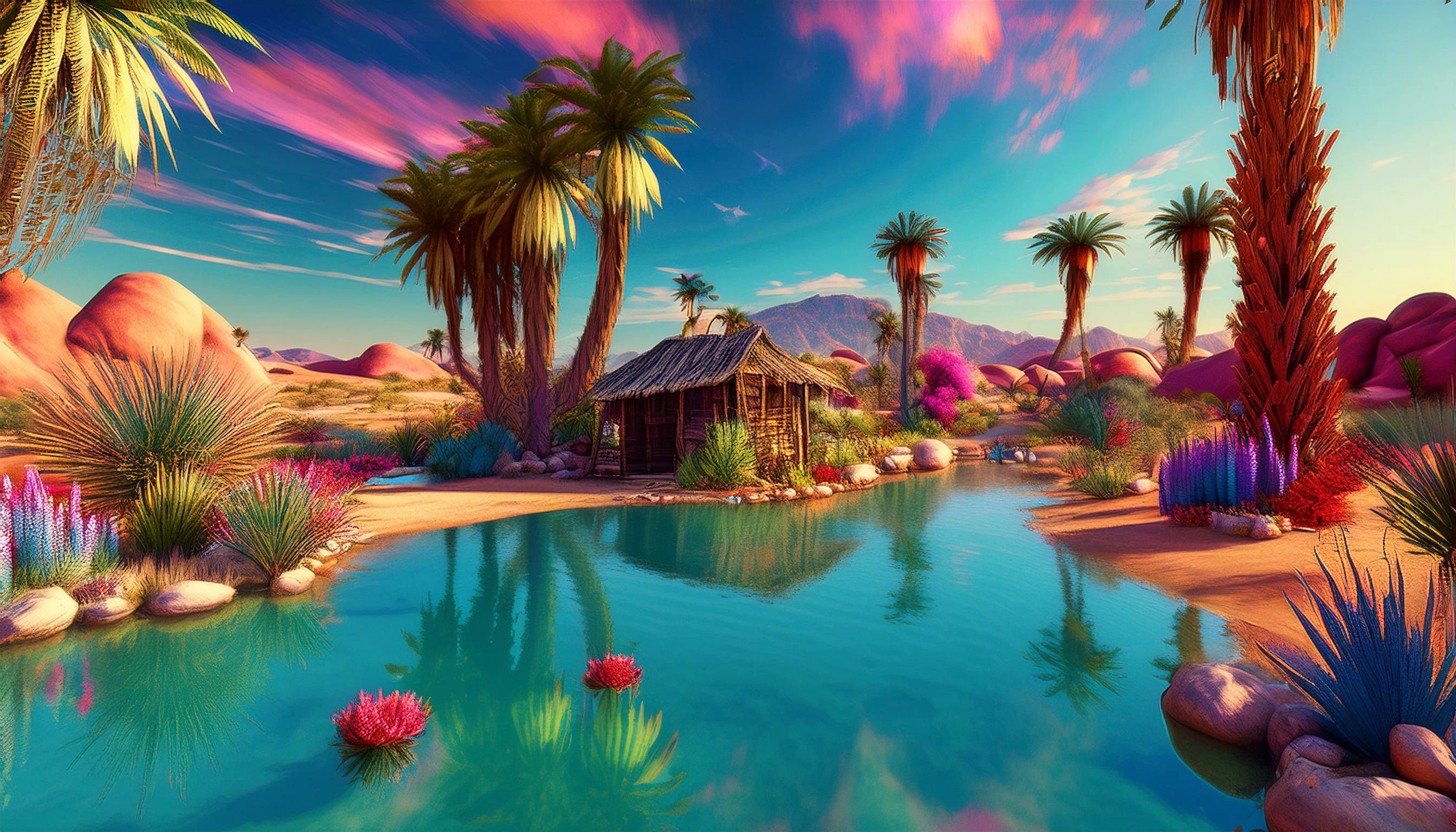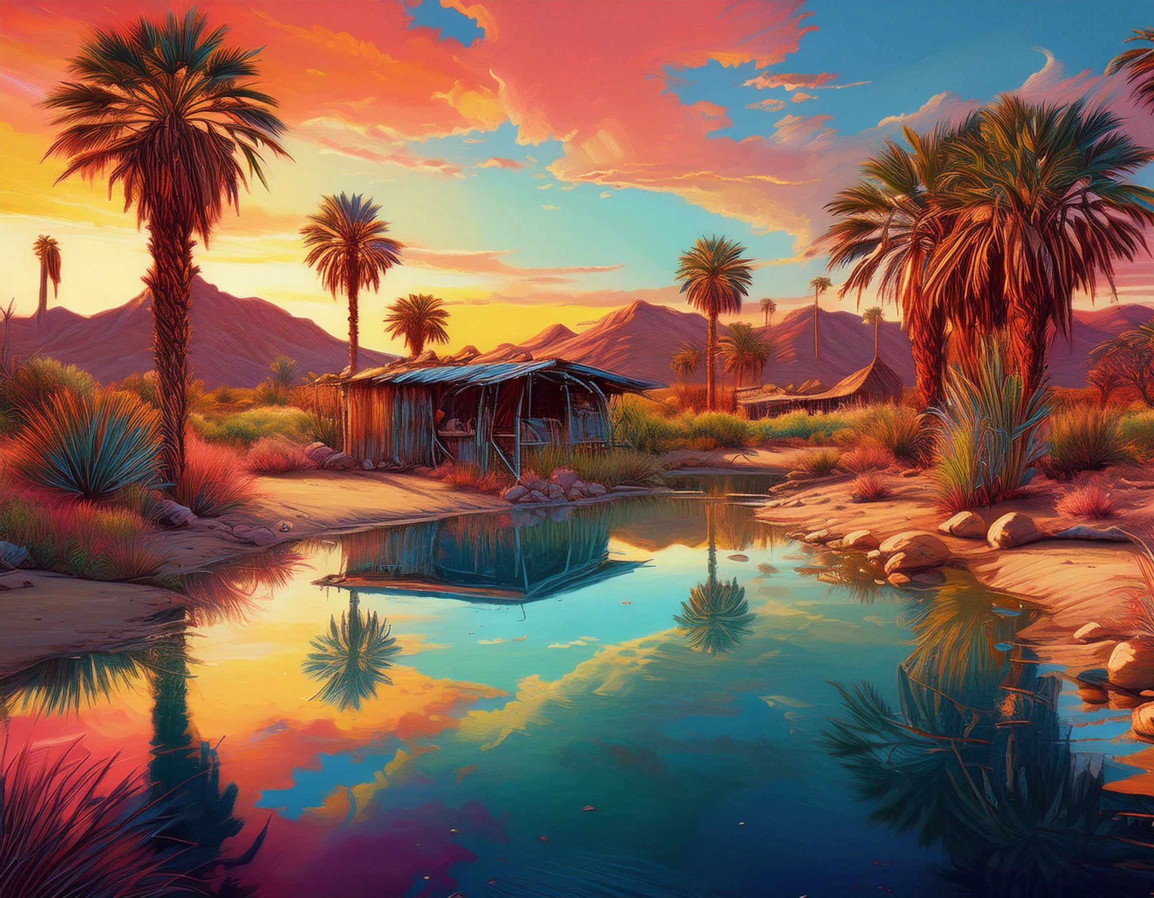 Prompt: A beautiful Oasis in the Mojave Desert, beautiful palm trees, a wonderful pond, a rustic shanty, vibrant color, psychedelic wonderland.