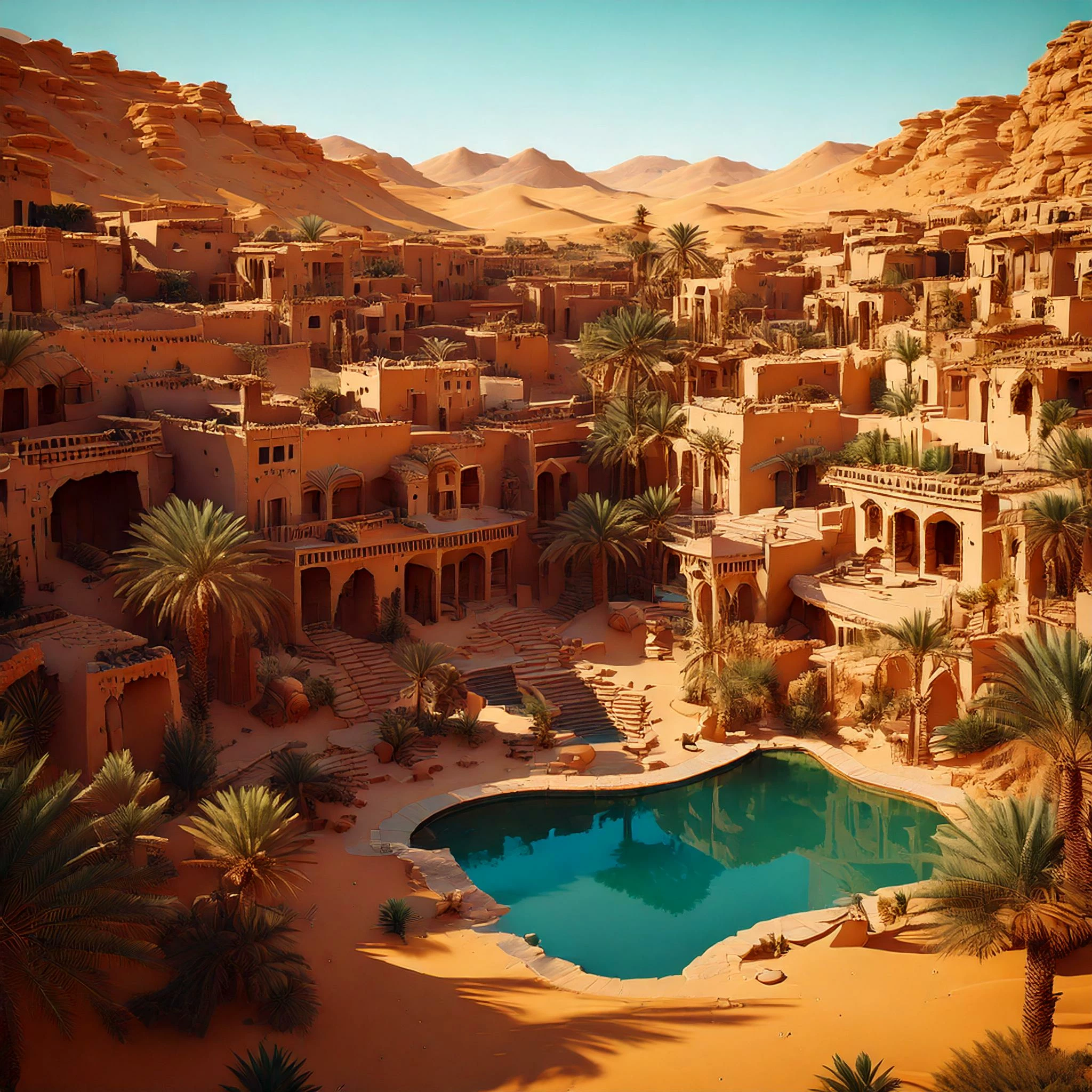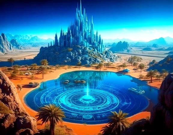 My prompt: Alien desert planet with cityscape, sharp angular buildings and an azure blue deep water pool