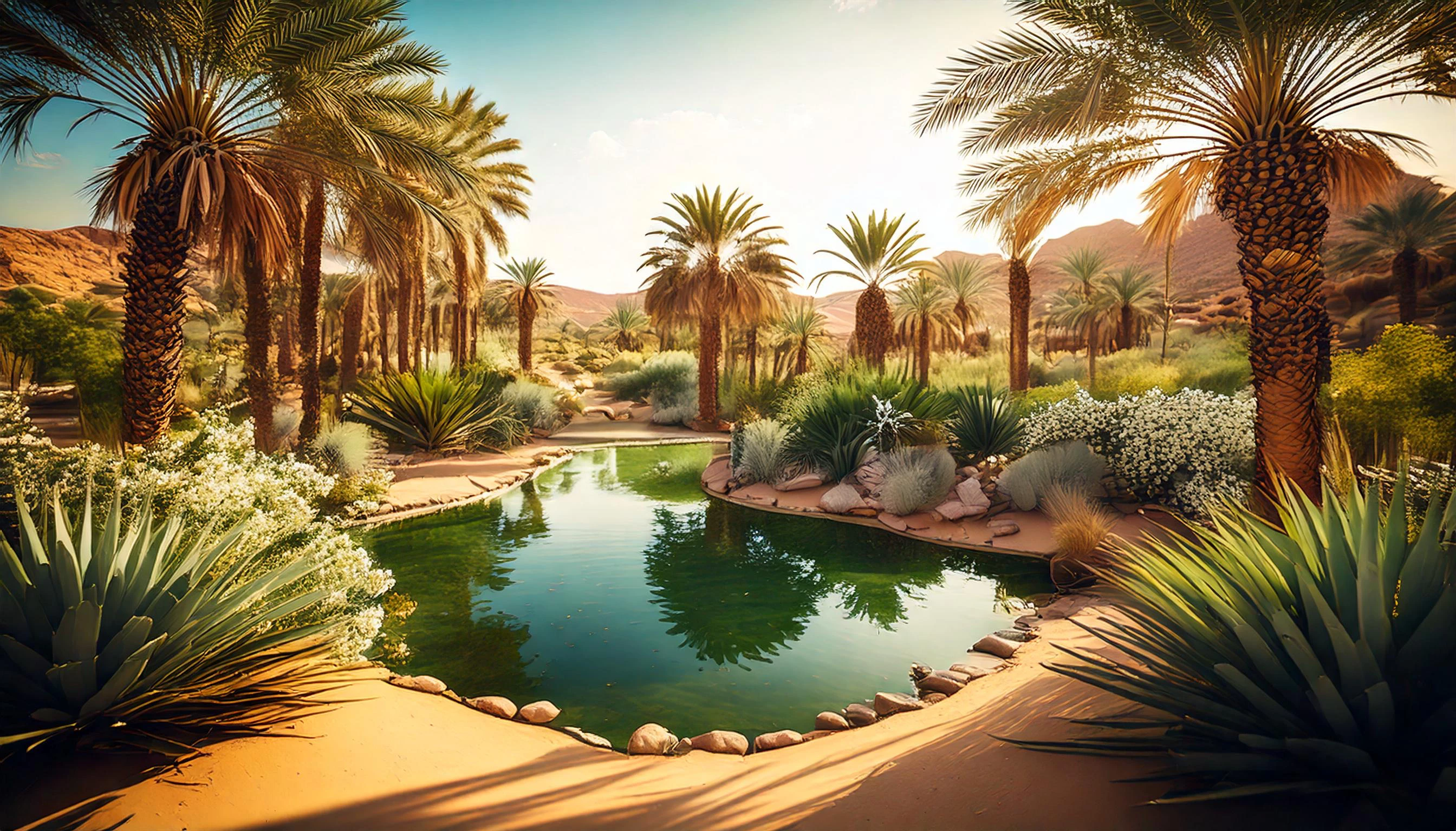 The Prompt I used: Imagine a peaceful oasis in the middle of a vast desert at dusk. The sun is just setting, painting the sky in warm oranges and reds. Palm trees surround a shimmering pool of water, and the gentle ripples reflect the last light of the day. The desert sands stretch endlessly in the background, and the air is cool and calm.