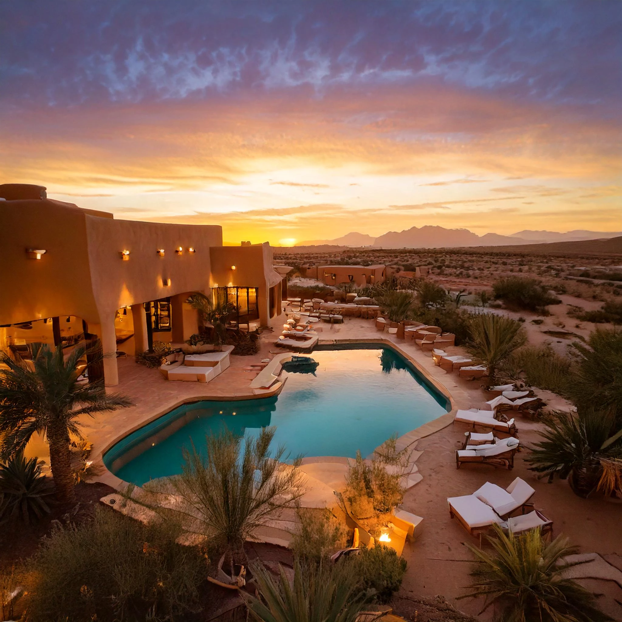 luxurious adobe hotel spa retreat in the desert with terraced landscaping that includes ample outdoor table seating, large pools, and hot tubs lined with beautiful landscaping, all lit by a warm, glowing sunset