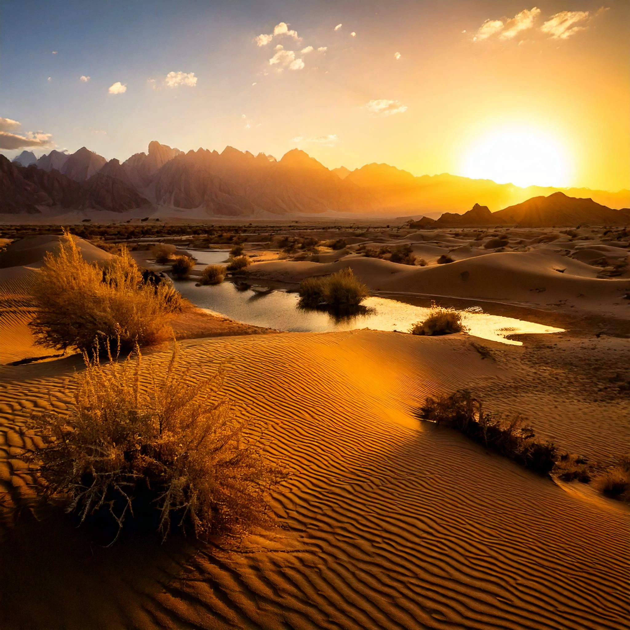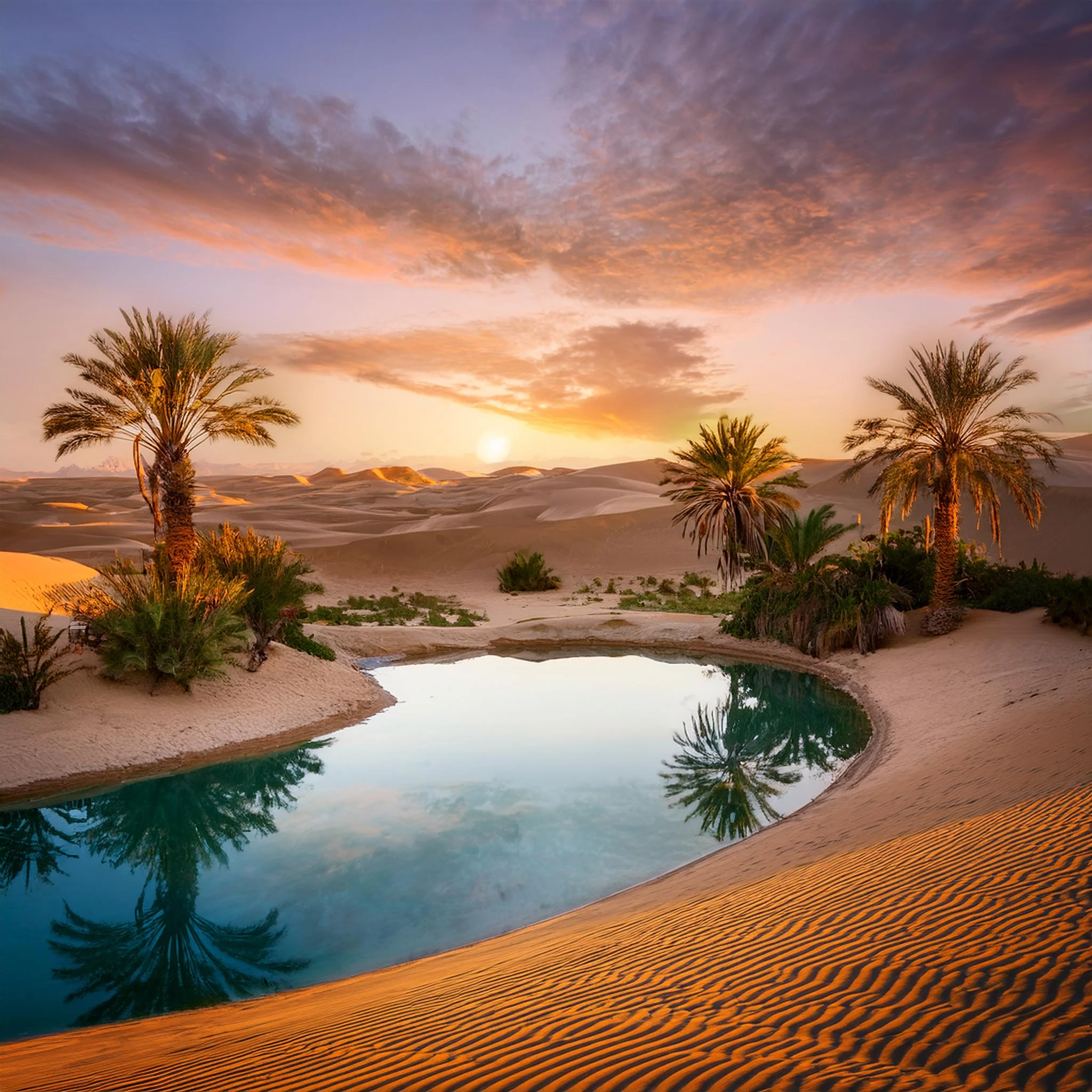A breathtaking desert oasis at twilight, surrounded by vast golden sand dunes. The sunset casts warm, vivid hues of orange, pink, and purple across the sky, with a crystal-clear water pool at the center reflecting the stunning colors. Lush palm trees and delicate flowers border the oasis, while soft shadows of distant dunes create depth and tranquility. The atmosphere is serene, magical, and perfect for moments of solitude and inspiration.
