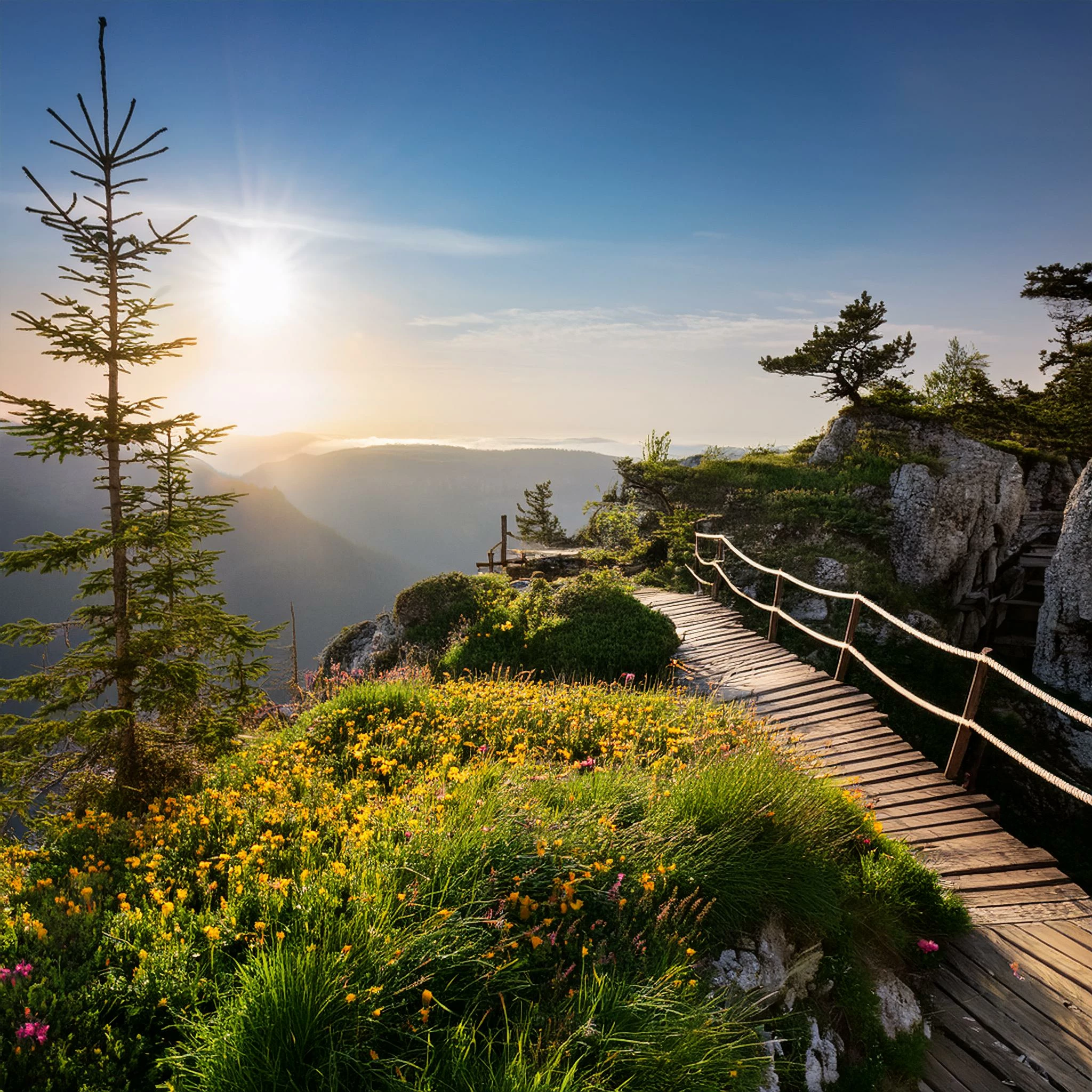 Prompt: sun setting on a cliff, trees, grass, wodden bridges, flowers, blue sky, mountains in the back
