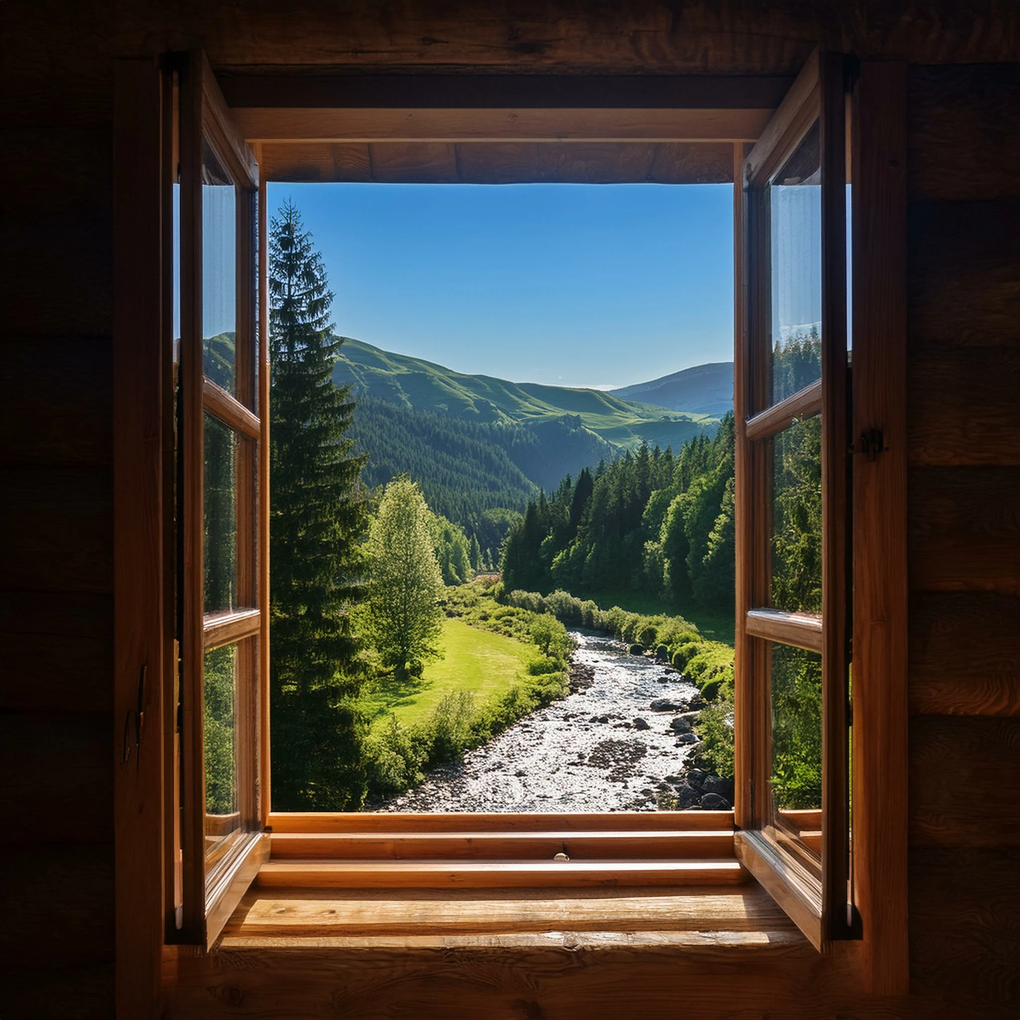 looking out window of cabin on mountain, looking down at a stream.