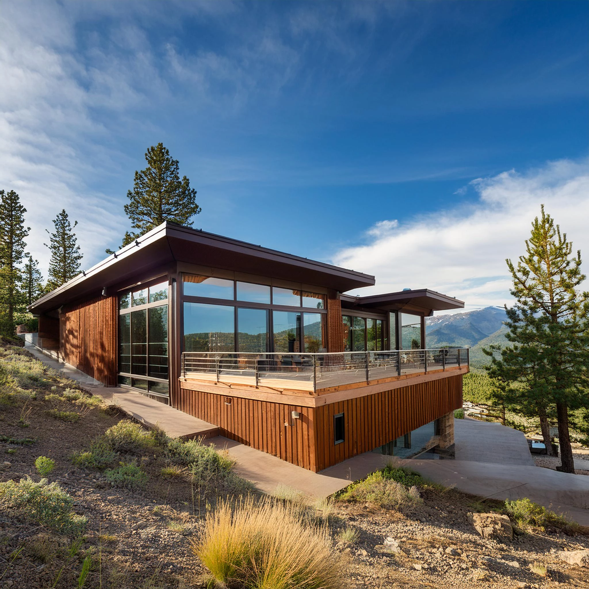 a luxurious 2-storey, large modern mountain lodge with lots of windows on a mesa with pines and pinion pines in Colorado with a panoramic view of the mountains