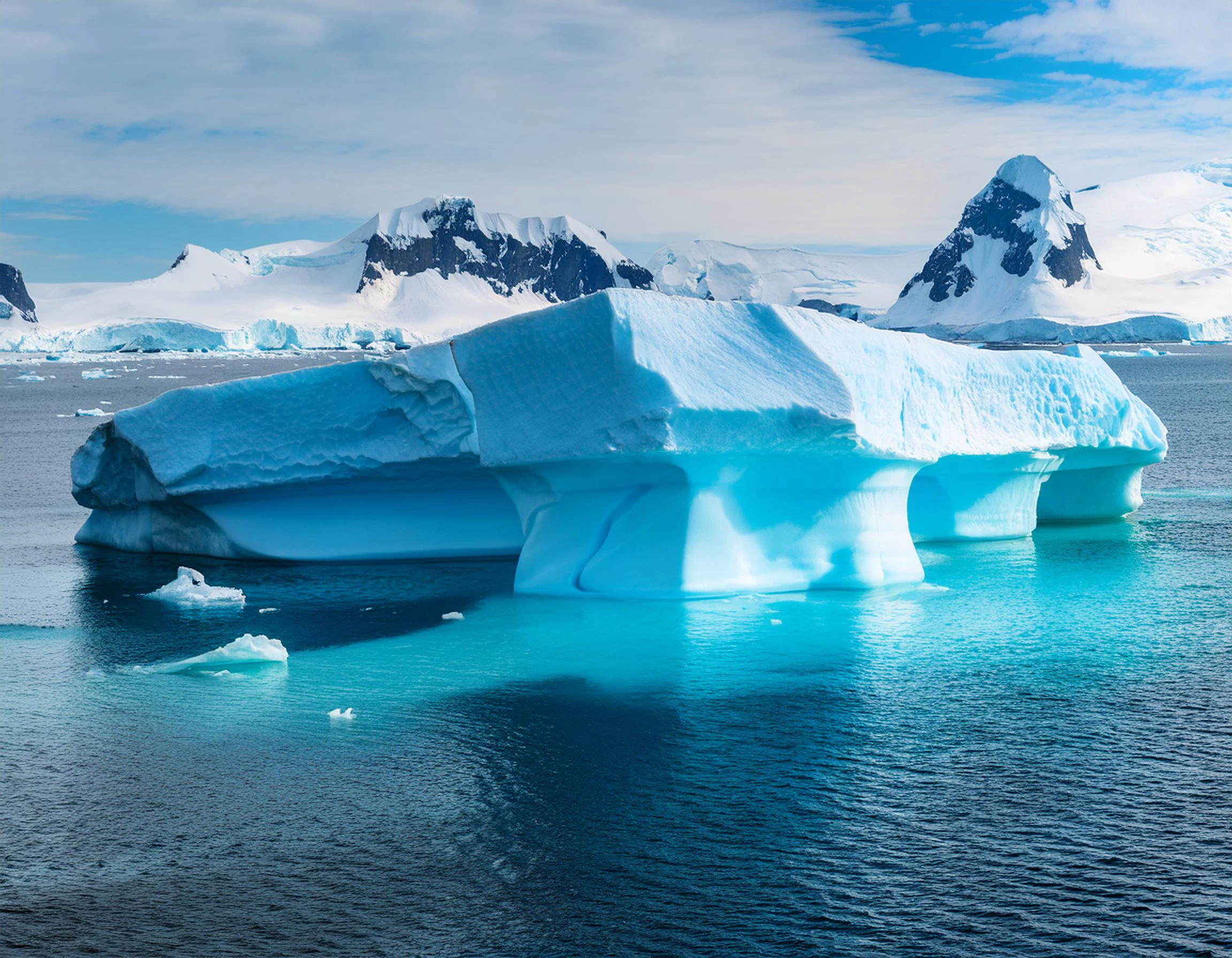 Turquoise icebergs floating in Antarctica.