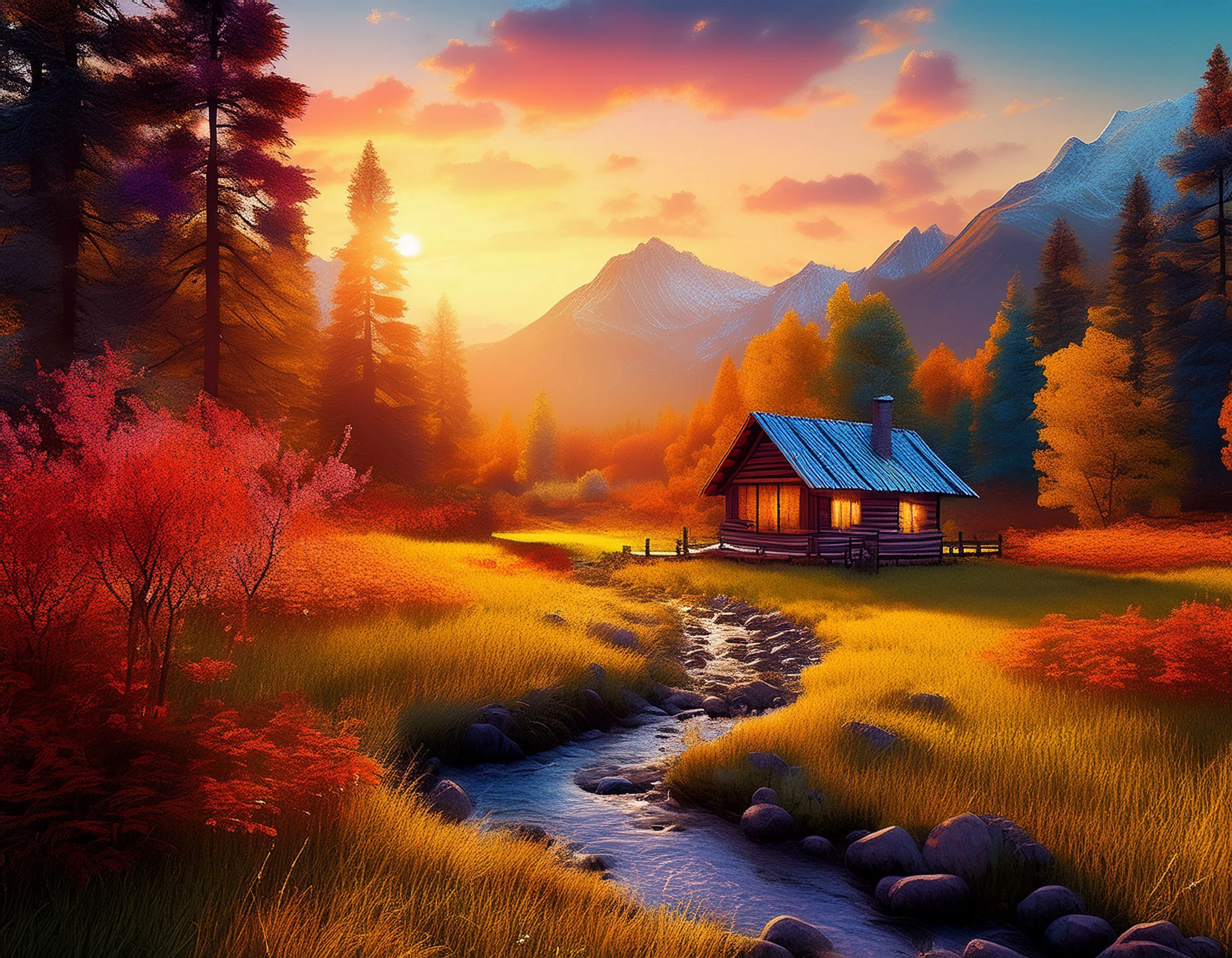 Forest cottage, near a stream, with mountains in the background, surrounded by trees, small path, small meadow, sunrise.
